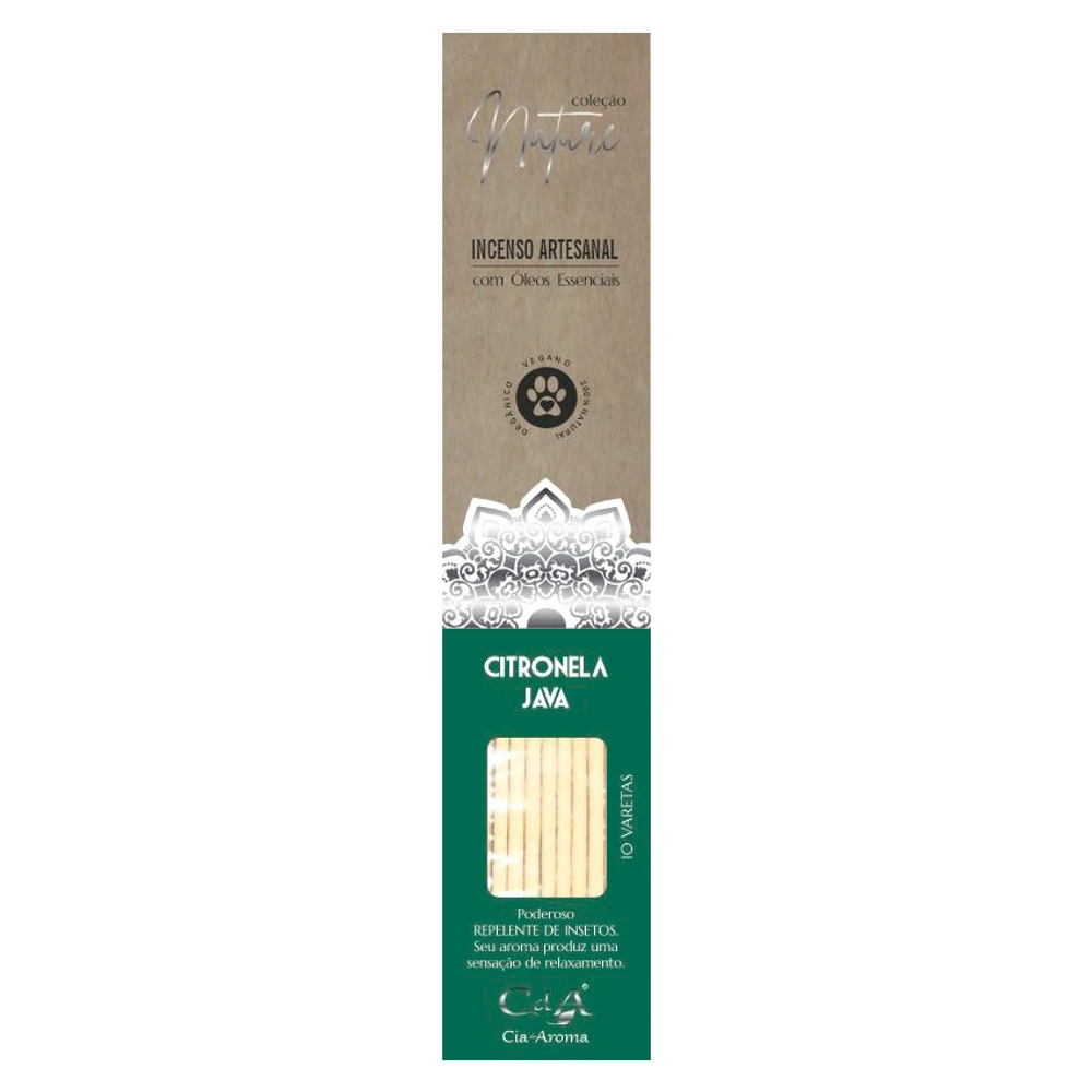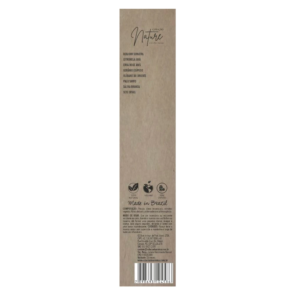 Incenso Coleção Nature - Vareta Citronela - CDA A Coleção Nature é produzida com óleos essenciais, orgânicos e naturais. Produzidos artesanalmente, orgânico, natural, sem adição de carvão. Com óleo essencial de Citronela. É um poderoso repelente de insetos e seu aroma produz uma sensação de relaxamento. Contém: 10 varetas. Tempo médio de queima de 60 minutos. Composição: fécula, óleos essenciais, extratos vegetais, pó de madeira e salitre orgânico. Validade: 24 meses Téc. Resp.: Juliano Nascimento Denicol – CRQ/V 05201095 Informação adicional Peso