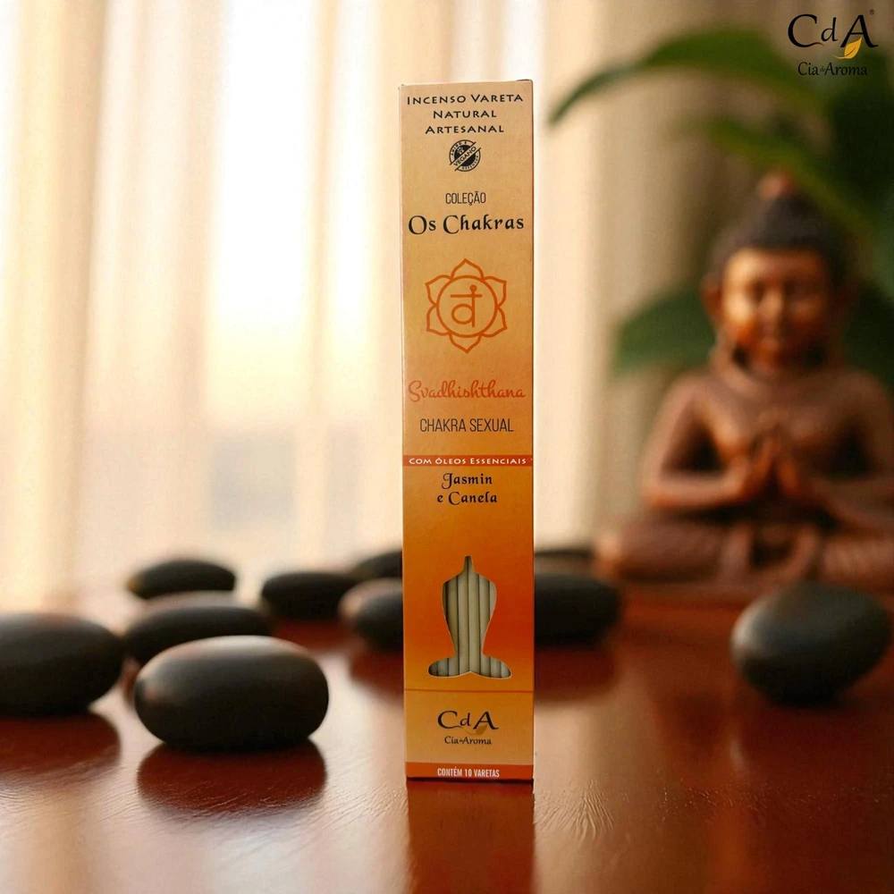 Incenso Coleção Nature - Os Chakras – Sexual - CDA Sexual 2º Chakra (Svadhisthana) – com óleos essenciais de Jasmin e Canela. Problemas com este chakra podem ser vistos através de problemas com os órgãos associados, como infecções do trato urinário, dor lombar e impotência. Emocionalmente, esse chakra está conectado aos nossos sentimentos de valor próprio e, ainda mais especificamente, nosso valor próprio em relação ao prazer, sexualidade e criatividade. Produto 100% artesanal e vegano. Composição: fragrância, óleo essencial, extratos vegetais, fécula, pó de madeira e salitre. Validade: 18 meses Informação adicional Peso
