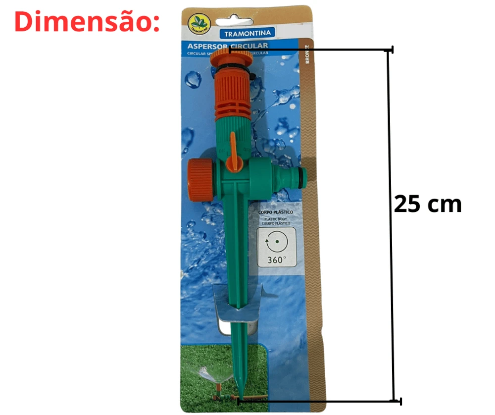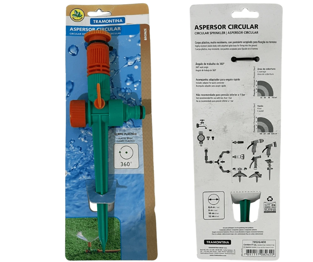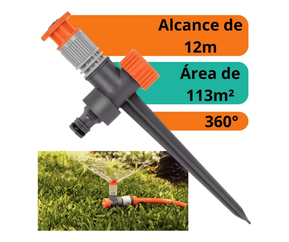 - Produto fabricado com matéria-prima de alta qualidade proporcionando uma irrigação precisa e confiável. - Corpo em plástico de alta resistência e pontalete acoplado para fixação no terreno. - Ângulo de trabalho de 0° a 360°. - Tem uma área de cobertura de até 113 m² ou diâmetro de alcance do jato d'água de até 12 m - a uma pressão de 4 bar. - O aspersor é conectado em mangueiras de 1/2", 5/8" e 3/4" através de sistema de engate rápido. - Sistema intercambiável que se adapta a todo o sistema de irrigação.
