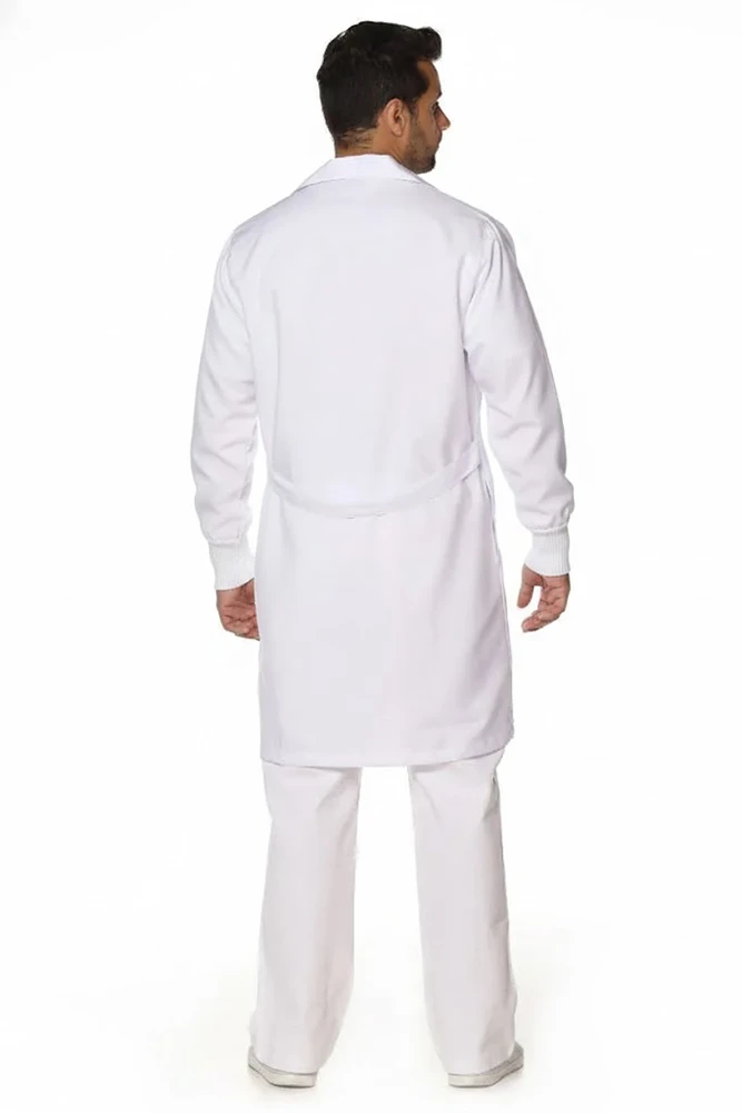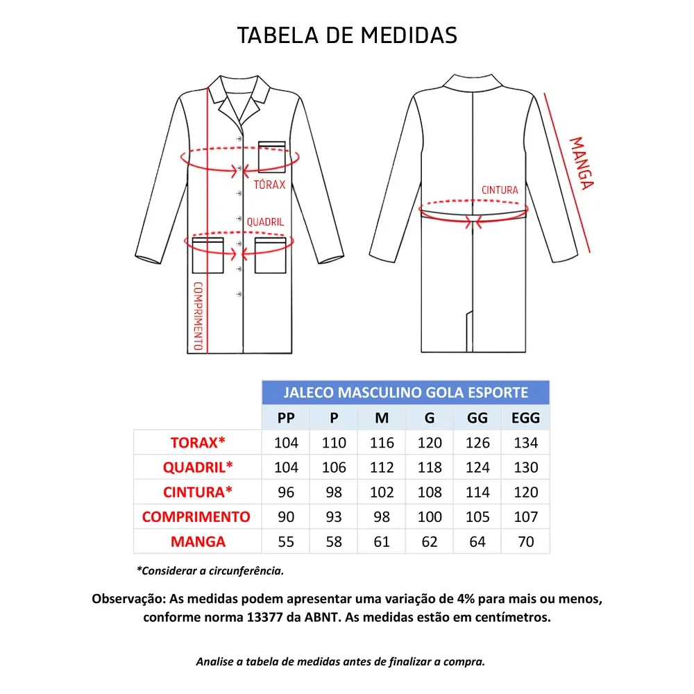 Jaleco masculino manga longa com punhos é confeccionado em tecido 100% algodão.