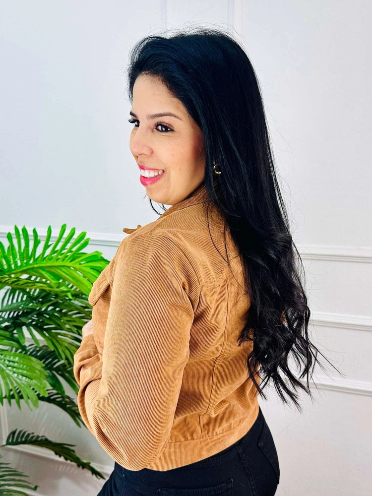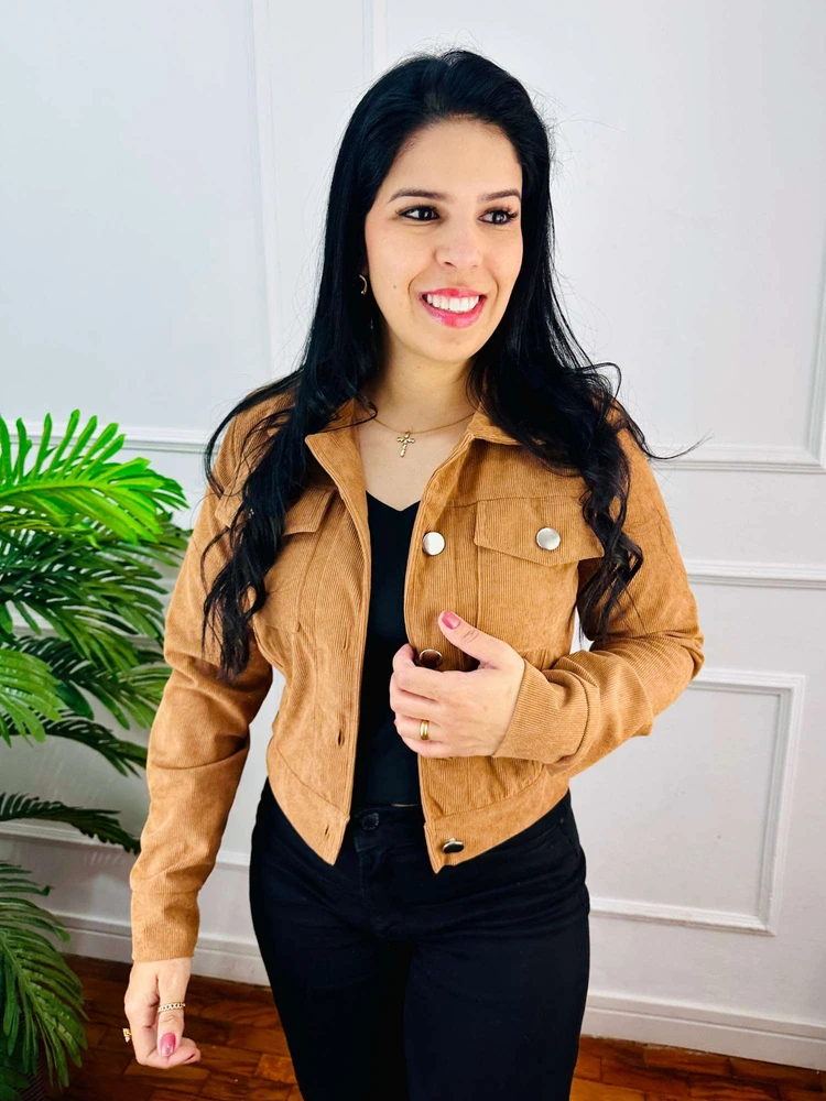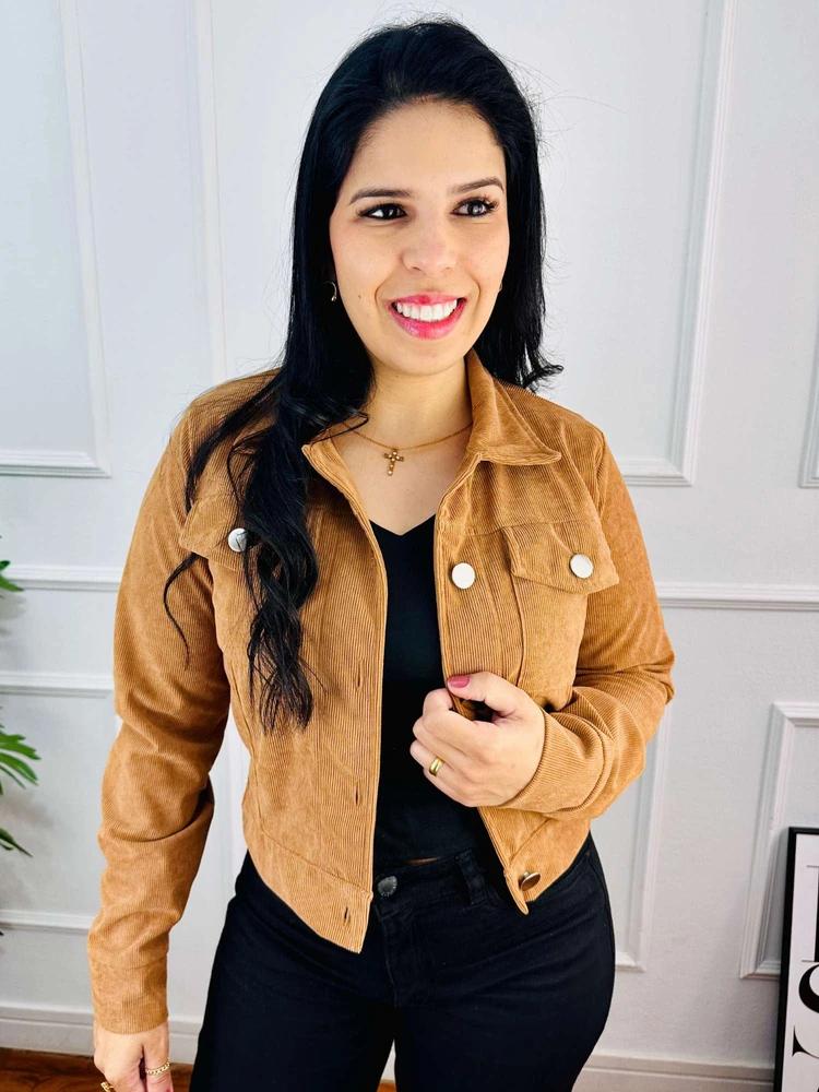 Jaqueta cropped em veludo cotelê, trazendo elegância e modernidade para seus looks.