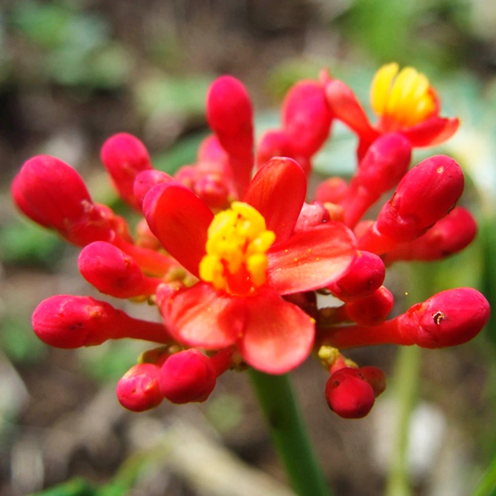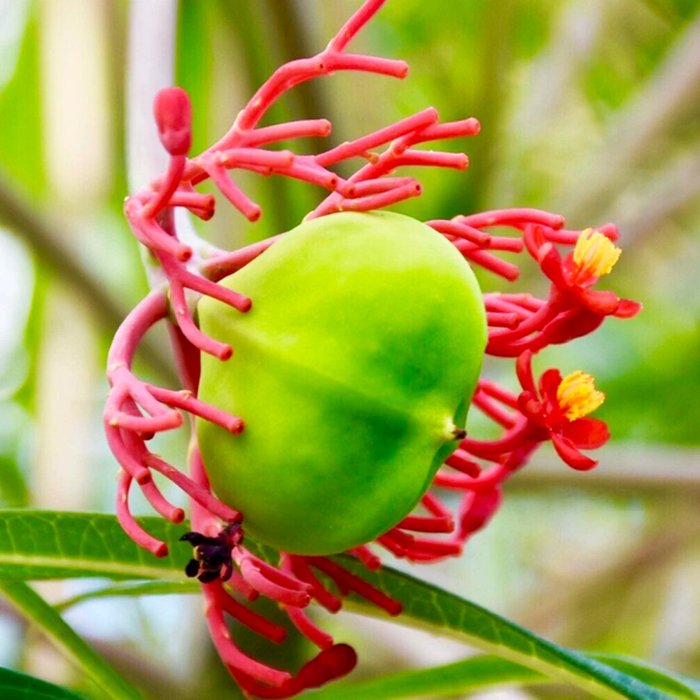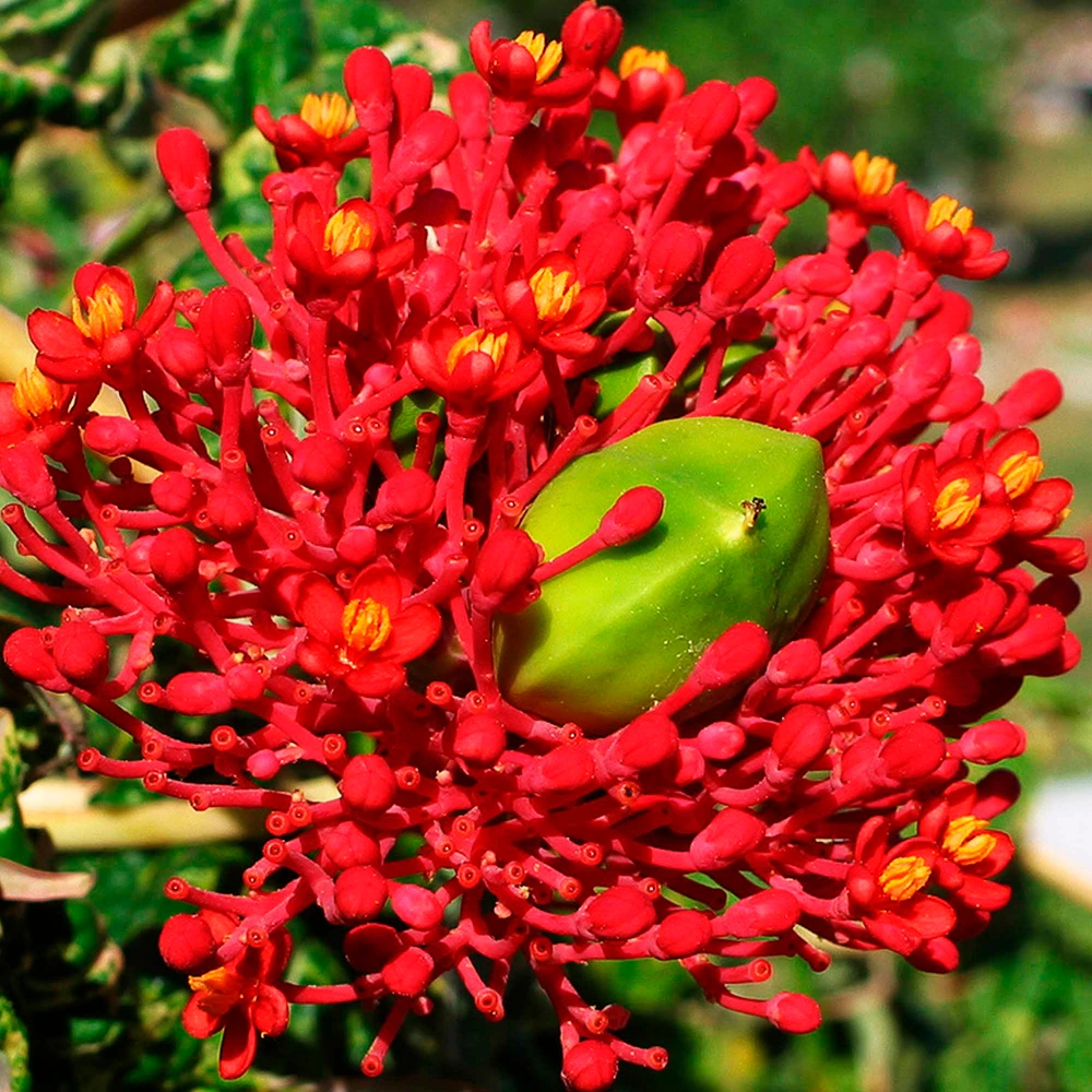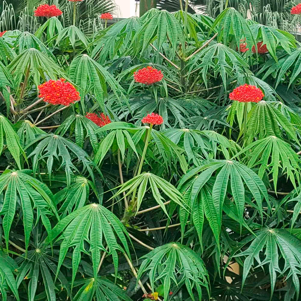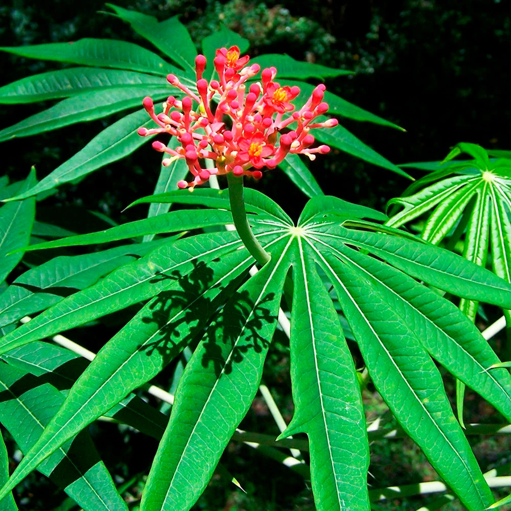 Jatropha multifida, também conhecida como Merthiolate, uma planta ornamental que se destaca pela exuberância das suas folhas palmadas e flores vermelhas vibrantes. Ideal para jardineiros e amantes de plantas exóticas que buscam valorizar seus jardins com espécies únicas e resistentes.