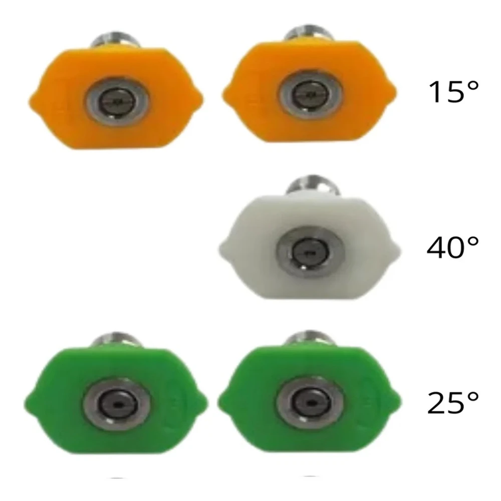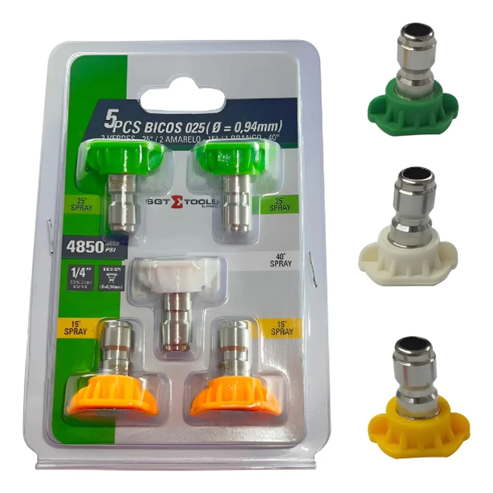 🧷 Itens inclusos: 2 bicos verdes (25°), 2 bicos amarelos (15°), 1 bico branco (40°)