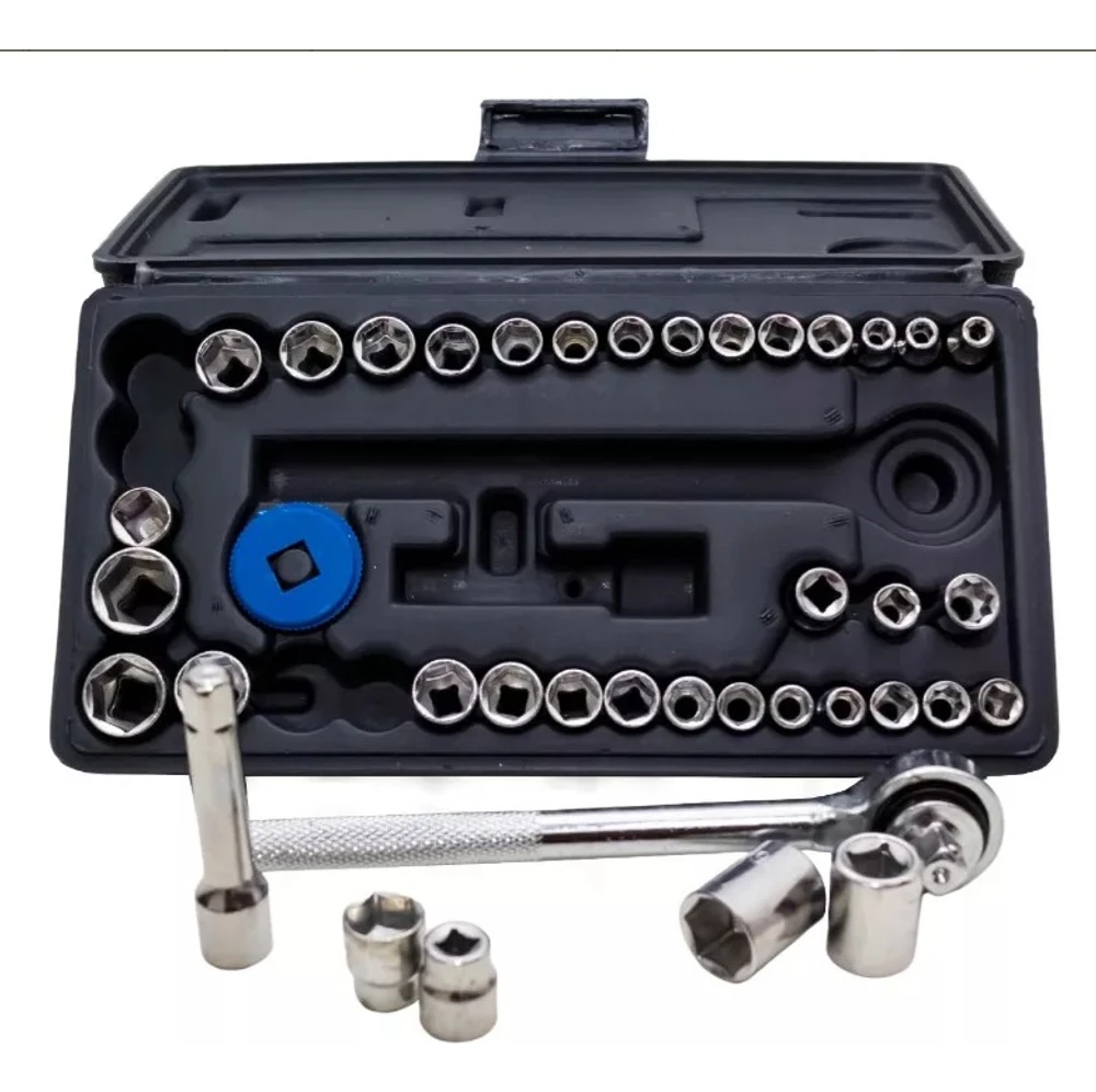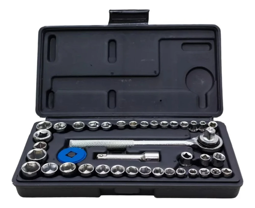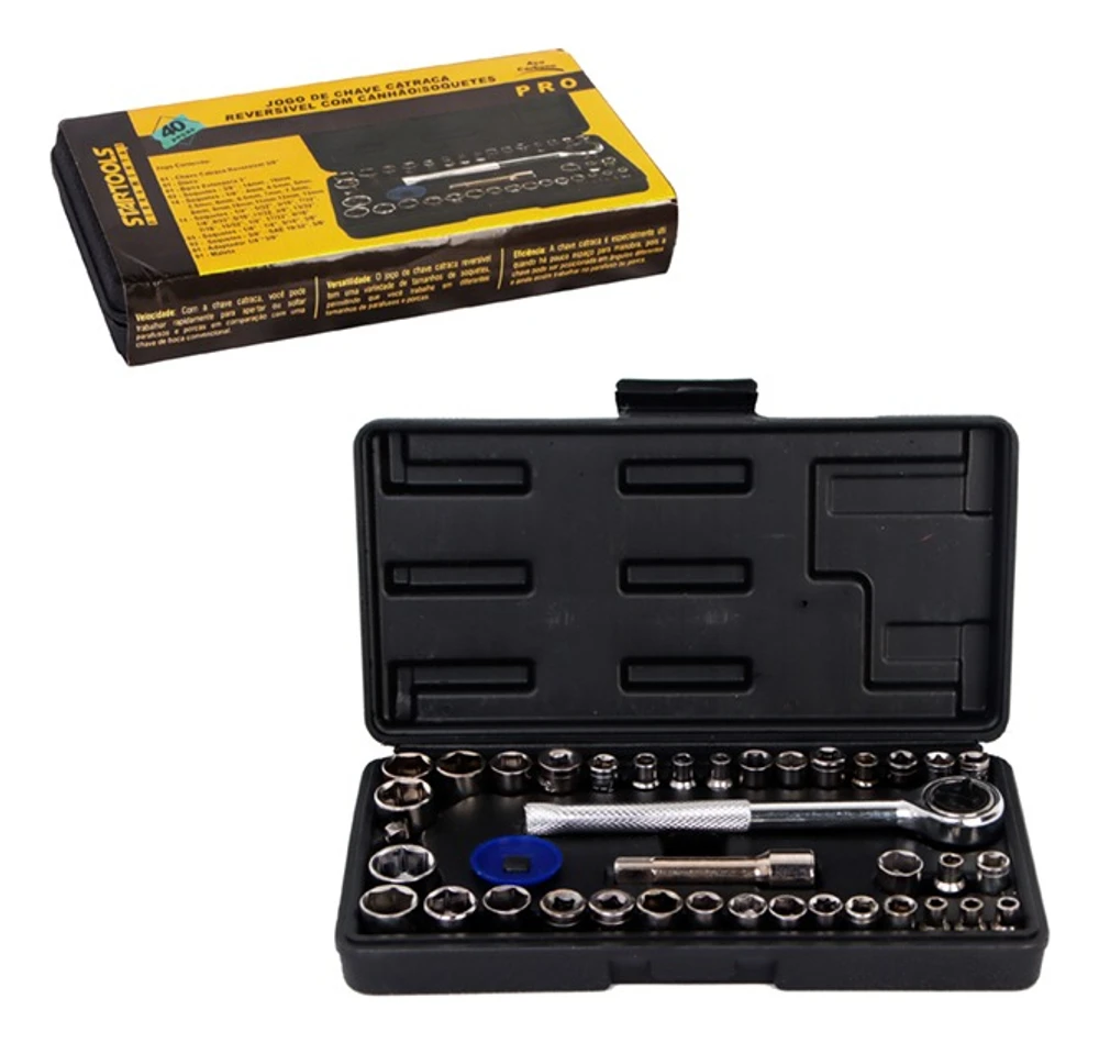 Jogo Chave Fenda Catraca Soquetes e Canhão 40 Peça STARLOOLSContém:1 (um) Chave Catraca Reversível 3/8"1 (um) Disco1 (um) Barra Extensora 3"2 (dois) Soquetes 3/8" - 14mm, 16mm14 (quatorze) Soquetes - 1/4" - 4mm, 4,5mm, 5mm, 5.5mm, 6mm, 7mm, 7.5mm, 8mm, 9mm, 10mm, 11mm, 12mm, 13mm14 (quatorze) Soquetes 1/4" - 5/32", 3/16", 7/32", 1/4", 9/32", 5/16", 11/32", 3/8", 13/32", 7/16", 15/32", 1/2", 17/32", 9/16"3 (três) Soquetes - 1/4" - 1/4", 5/16", 3/8"2 (dois) Soquetes - 3/8" - SAE 19/32", 5/8"1 (um) Adaptador 1/4"*3/8"1 (um) MaletaProduto Original.- Fácil manuseio.- Estética original.Características:Cor predominante: Cromado/ Preto.Composição: Aço CarbonoQualquer dúvida nos questione através da opção ?fale com o vendedor? ou pelo ?Chat? da sua compra. Estamos à disposição para tornar sua compra satisfatória. Possuímos suporte técnico especializado para realizar seu atendimento. Entre em contato conosco, aguardamos seu contato.Ecommerce levado a sério!Nossa prioridade é o Cliente tendo como foco a alta performance em atendimento e prestação de serviços, prezando sempre pela pontualidade, profissionalismo, qualidade, eficácia e controle dos serviços prestados.