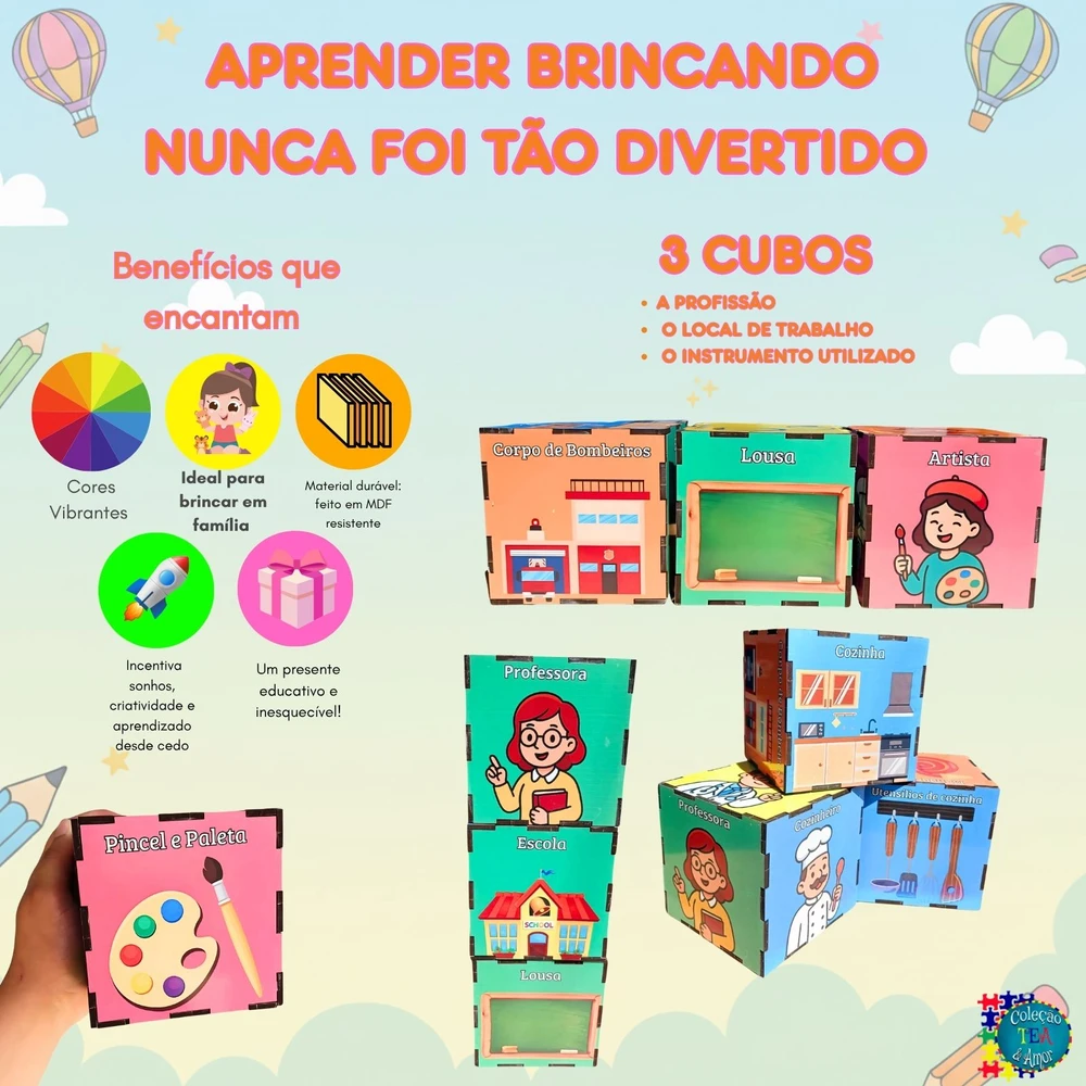Jogo das Profissões Cubos em MDF Coloridos e Educativos