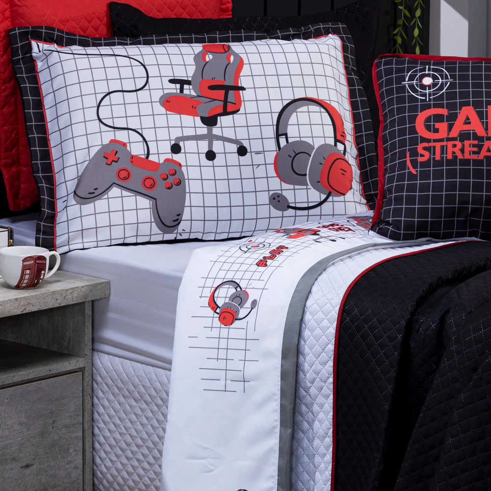 Confira o Jogo de Cama Game Streamer, com lindos detalhes que foram desenvolvidos especialmente para deixar o seu quarto ainda mais elegante. Esses lençóis são fabricados em tecido Percal 200 fios, trazendo mais conforto, resistência e praticidade na hora de lavar. Sempre visando conforto e a beleza de sua decoração e de quem você ama! Confira!