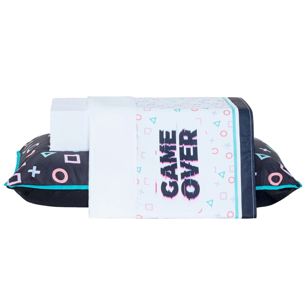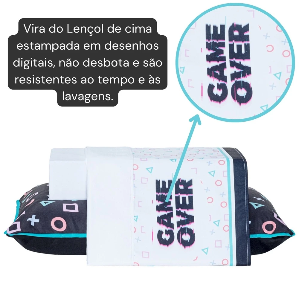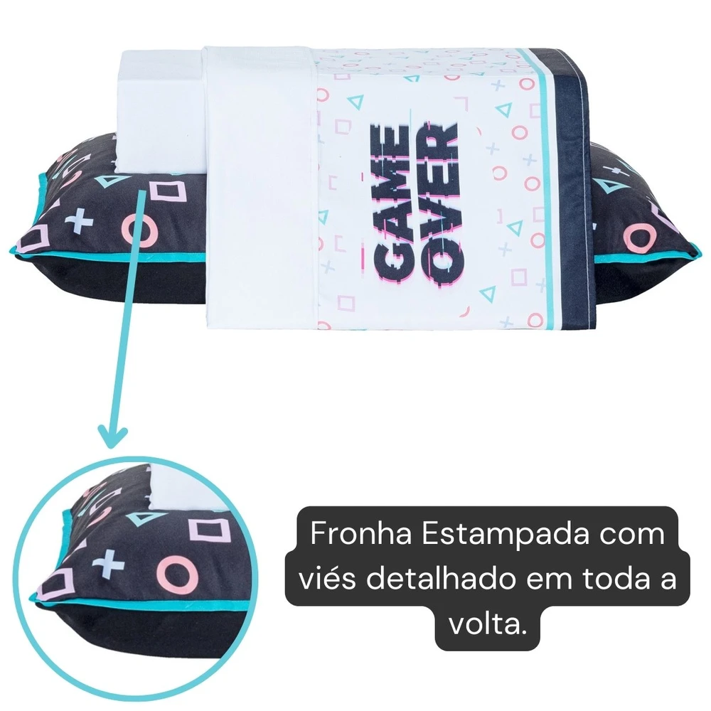 Apresentamos o Jogo de Cama Game Over, uma escolha divertida e confortável para os pequenos amantes de videogame em sua vida. Este conjunto de três peças é confeccionado com percal de 200 fios, garantindo uma sensação de maciez e qualidade excepcionais. O design vibrante e cheio de personalidade apresenta estampas coloridas e divertidas, incluindo ícones e elementos de video-games marcantes e também a frase "Game Over", trazendo todo o encanto e nostalgia do mundo dos jogos para o quarto do seu filho. Cada conjunto inclui um lençol de baixo ajustável, um lençol de cima com vira estampada e uma fronha, todos projetados para se encaixarem perfeitamente em um colchão solteiro padrão. Além de serem visualmente cativantes, esses lençóis são duráveis e fáceis de cuidar, garantindo conforto e praticidade para os pais. Seja para uma noite de sono cheia de aventuras virtuais ou para dias de brincadeiras animadas, este jogo oferece o cenário perfeito para a imaginação do seu pequeno gamer. Transforme o quarto em um playground de diversão e conforto com este conjunto incrível! Confira!