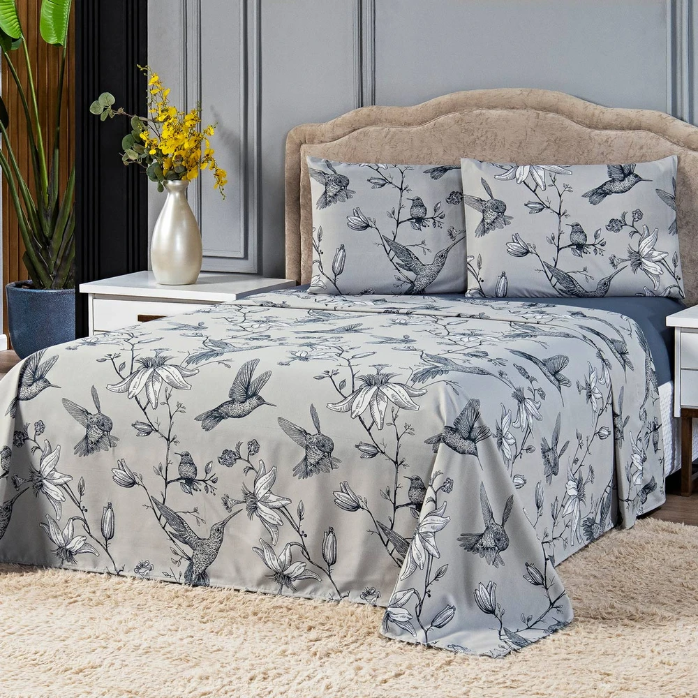 Mergulhe na suavidade e na beleza com o nosso Jogo de Lençol Beija-flor, um convite para uma experiência de sono luxuosa e elegante. Este conjunto é um verdadeiro mimo para o seu refúgio de descanso. Fabricado em tecido percal de 300 fios acetinado, cada fibra deste jogo de cama é meticulosamente trabalhada para oferecer um toque de maciez incomparável. Este tecido de alta qualidade garante não apenas conforto, mas também durabilidade, proporcionando noites de sono aconchegantes por muito tempo. O destaque deste conjunto é o seu encantador padrão de beija-flor em tons de azul e cinza, que adiciona um toque de encanto e delicadeza ao seu quarto. Esta estampa vibrante é uma verdadeira obra de arte, transformando seu espaço de descanso em um refúgio de tranquilidade e beleza. Além disso, a qualidade do tecido percal proporciona uma sensação de frescor durante todas as estações do ano, garantindo que você durma confortavelmente, esteja fazendo calor ou frio lá fora. O conjunto inclui um lençol de elástico todo liso em azul petróleo, um lençol de cima todo estampado e duas fronhas coordenadas, completando o visual harmonioso do seu ambiente. Prepare-se para noites de sono revigorantes e sonhos doces com este jogo de cama. Desperte todos os dias renovado e revigorado, pronto para enfrentar o mundo com uma nova energia, graças ao conforto e elegância deste conjunto excepcional. Confira!