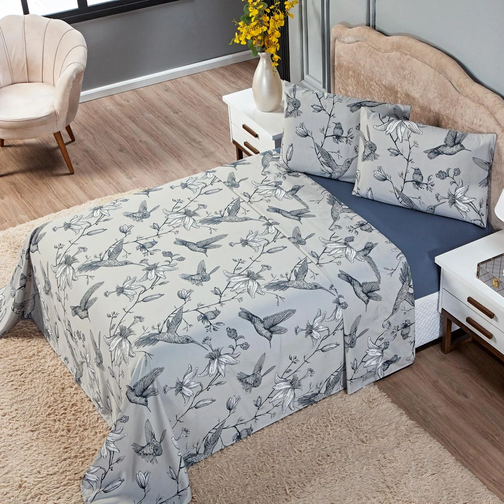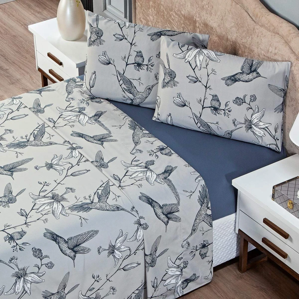 Mergulhe na suavidade e na beleza com o nosso Jogo de Lençol Beija-flor, um convite para uma experiência de sono luxuosa e elegante. Este conjunto é um verdadeiro mimo para o seu refúgio de descanso. Fabricado em tecido percal de 300 fios acetinado, cada fibra deste jogo de cama é meticulosamente trabalhada para oferecer um toque de maciez incomparável. Este tecido de alta qualidade garante não apenas conforto, mas também durabilidade, proporcionando noites de sono aconchegantes por muito tempo. O destaque deste conjunto é o seu encantador padrão de beija-flor em tons de azul e cinza, que adiciona um toque de encanto e delicadeza ao seu quarto. Esta estampa vibrante é uma verdadeira obra de arte, transformando seu espaço de descanso em um refúgio de tranquilidade e beleza. Além disso, a qualidade do tecido percal proporciona uma sensação de frescor durante todas as estações do ano, garantindo que você durma confortavelmente, esteja fazendo calor ou frio lá fora. O conjunto inclui um lençol de elástico todo liso em azul petróleo, um lençol de cima todo estampado e duas fronhas coordenadas, completando o visual harmonioso do seu ambiente. Prepare-se para noites de sono revigorantes e sonhos doces com este jogo de cama. Desperte todos os dias renovado e revigorado, pronto para enfrentar o mundo com uma nova energia, graças ao conforto e elegância deste conjunto excepcional. Confira!