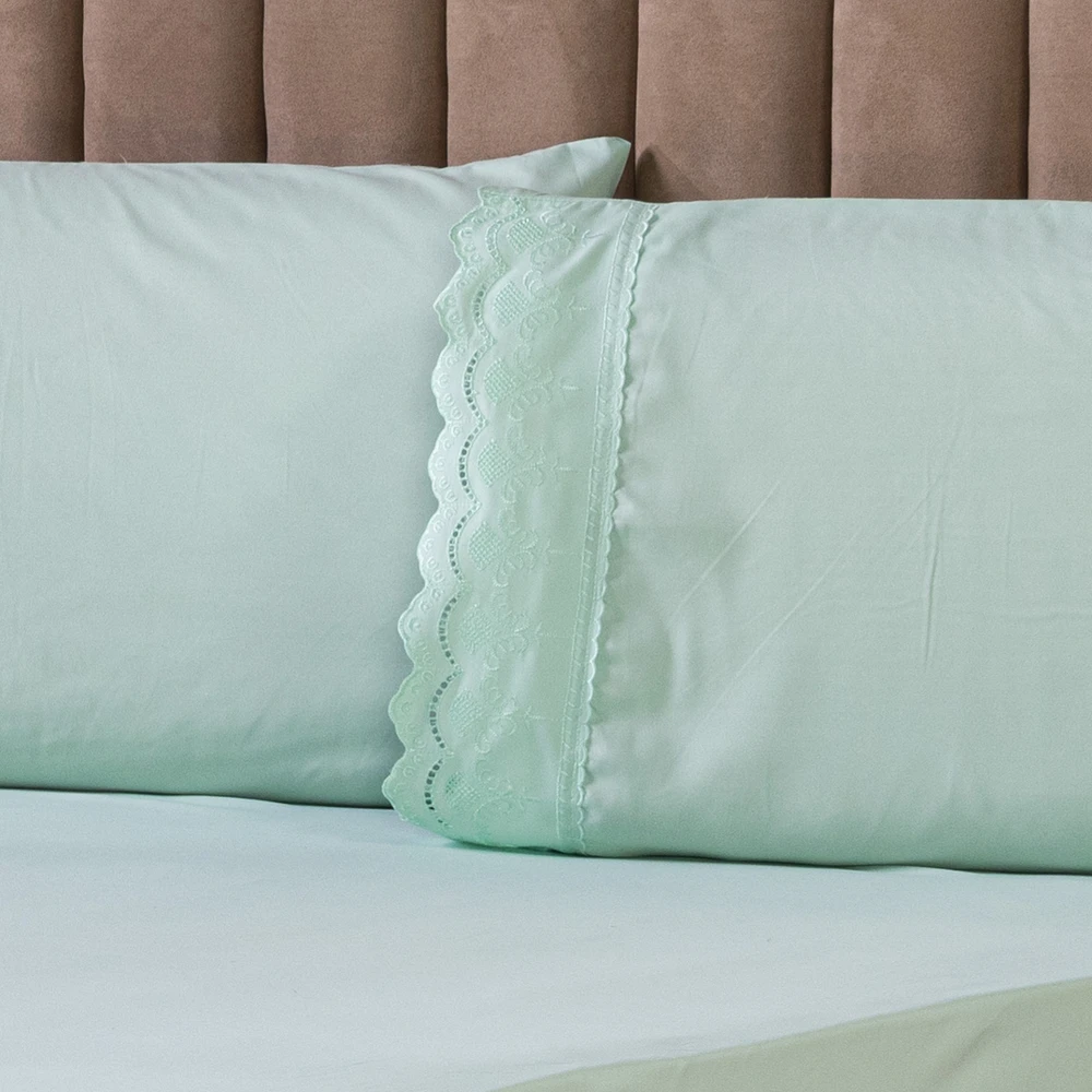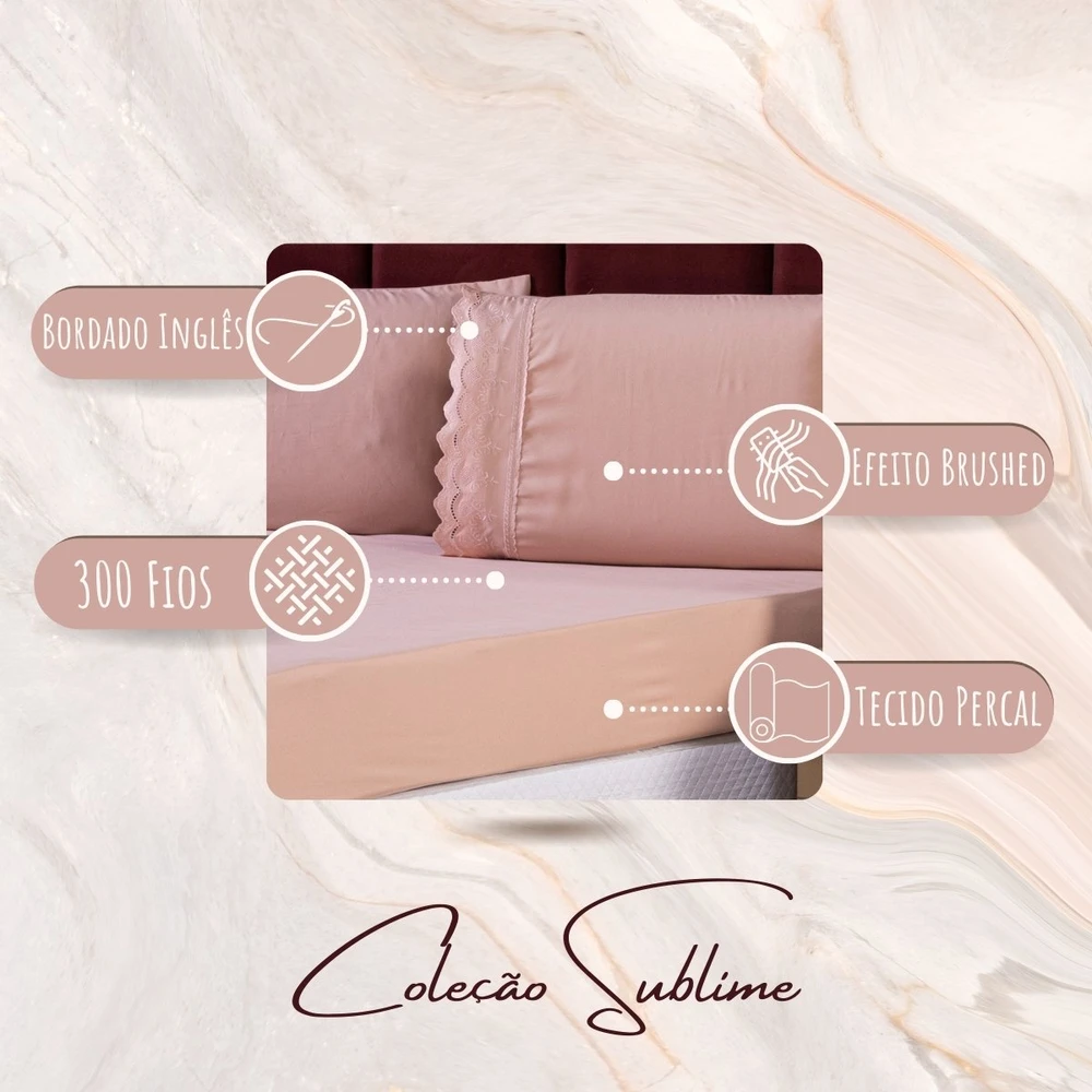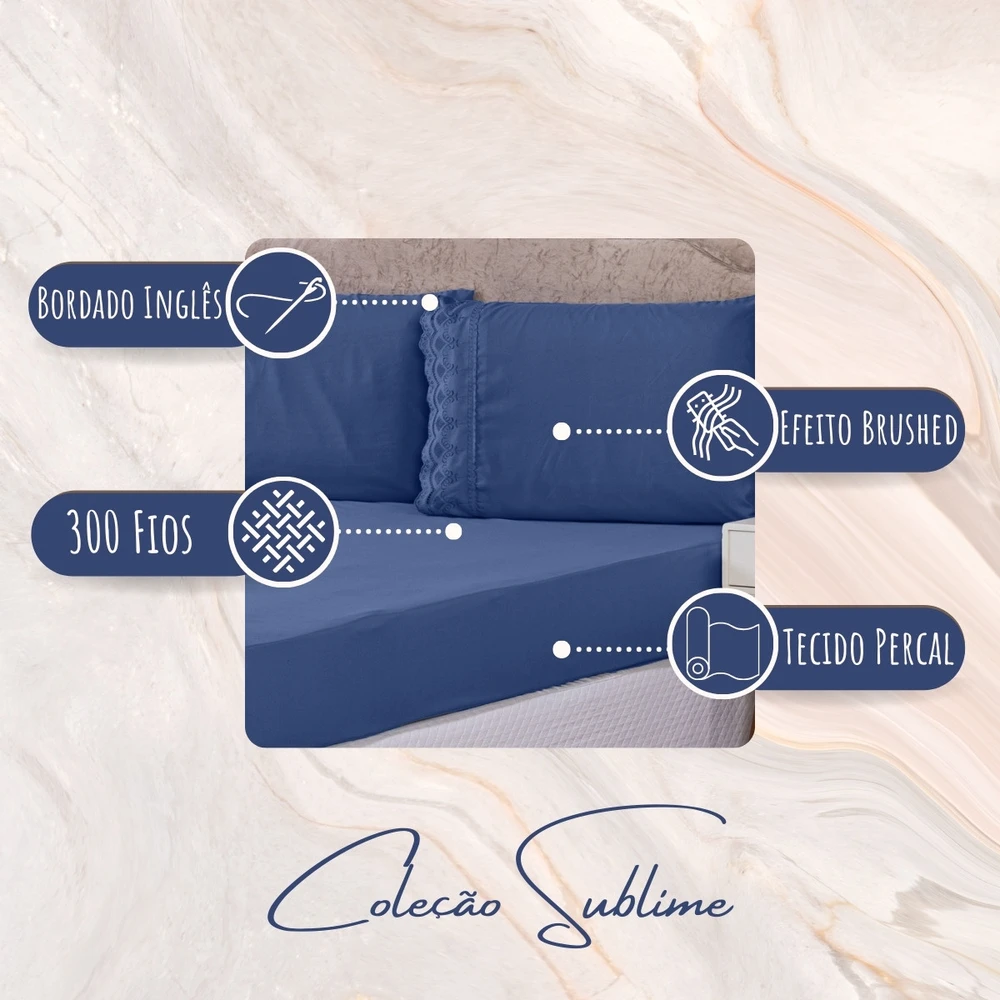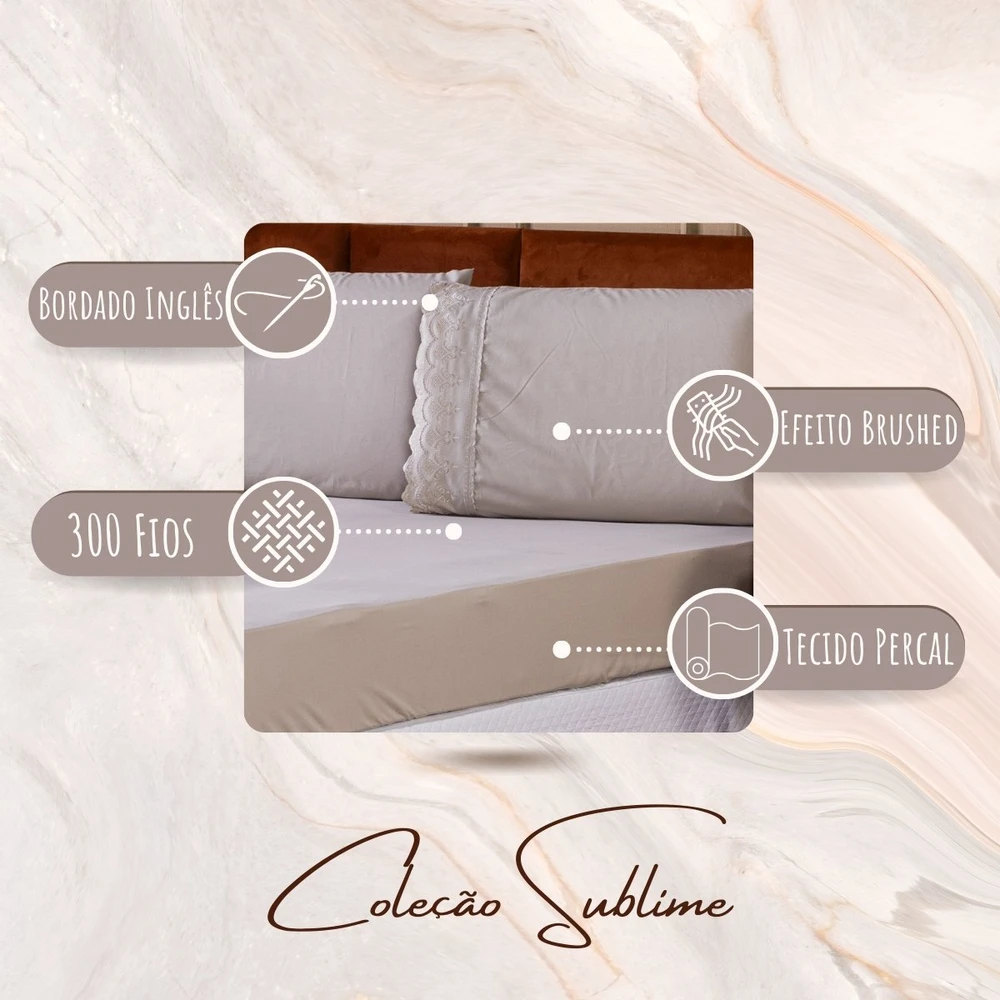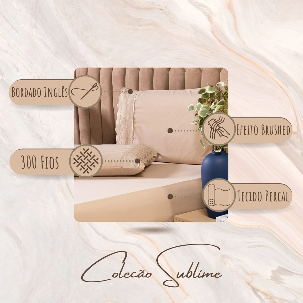O Jogo de Cama Sublime é a escolha perfeita para quem busca elegância e conforto em cada detalhe. Confeccionado em Percal 300 Fios juntamente com a tecnologia do efeito Brushed duplamente escovado, oferece um toque acetinado que proporciona uma sensação de suavidade e frescor, ideal para noites de sono relaxantes. O delicado bordado inglês nas fronhas traz um toque de sofisticação ao conjunto, fazendo com que seu quarto ganhe um charme extra. Composto por 1 lençol de baixo com elástico para ajuste perfeito e 2 fronhas com acabamento refinado, esse jogo de lençol é ideal para camas de tamanho casal padrão. O toque acetinado confere um brilho suave que adiciona um charme sutil ao ambiente, tornando-o ainda mais acolhedor e elegante. Este conjunto combina a alta qualidade do Percal 300 Fios com a beleza atemporal do bordado inglês, resultando em um produto de alta durabilidade que mantém sua suavidade e aspecto impecáveis após diversas lavagens. Perfeito para quem deseja transformar o quarto em um verdadeiro refúgio de conforto e sofisticação. Confira!
