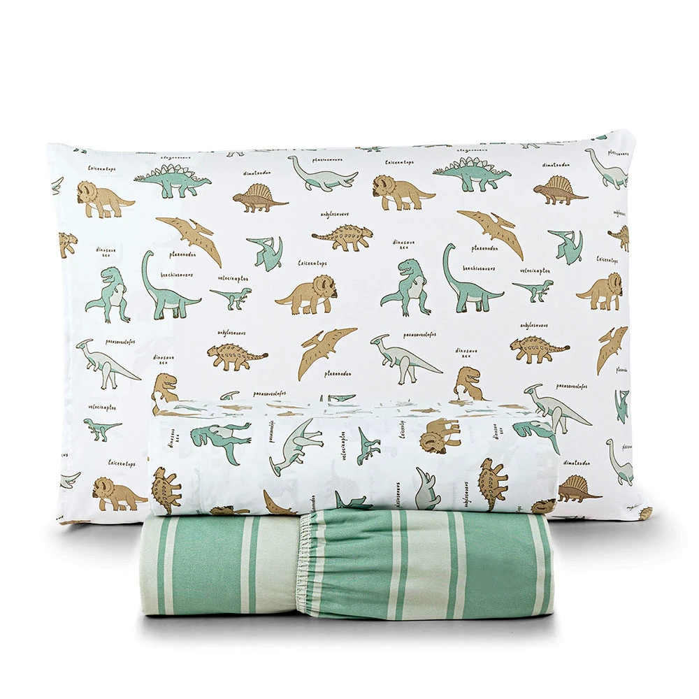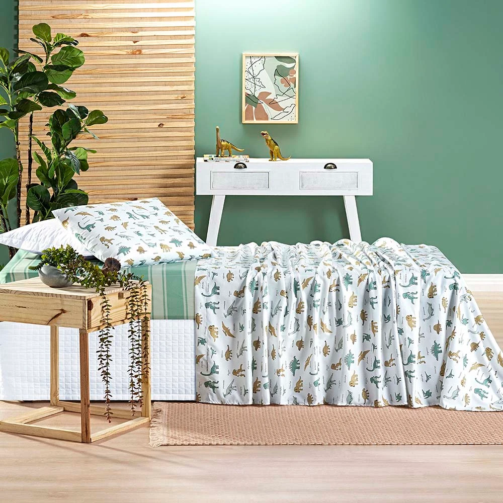 Jogo de Cama Lençol Lutti Solteiro Infantil 200 Fios Estampado 3 Peças Dinossauro Verde