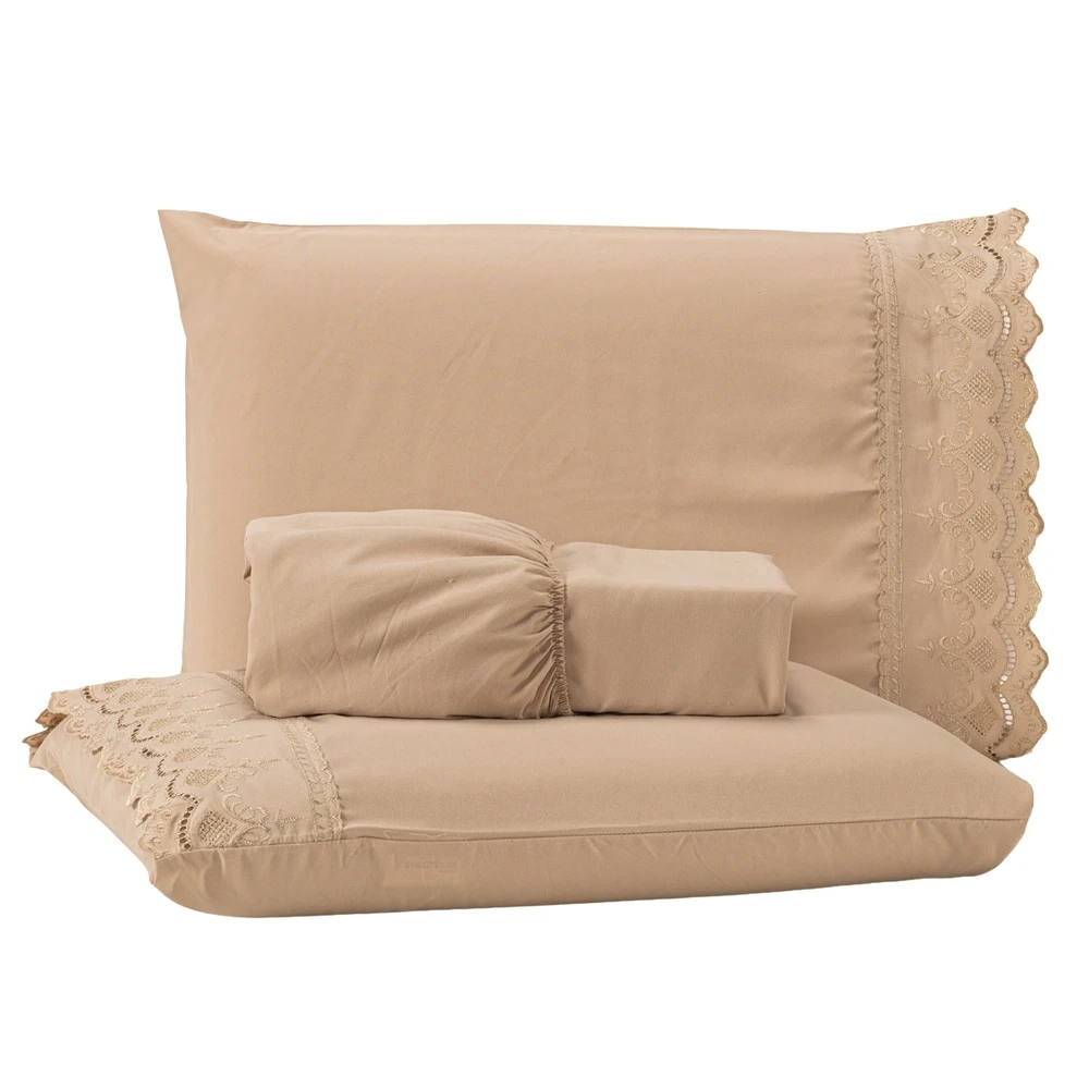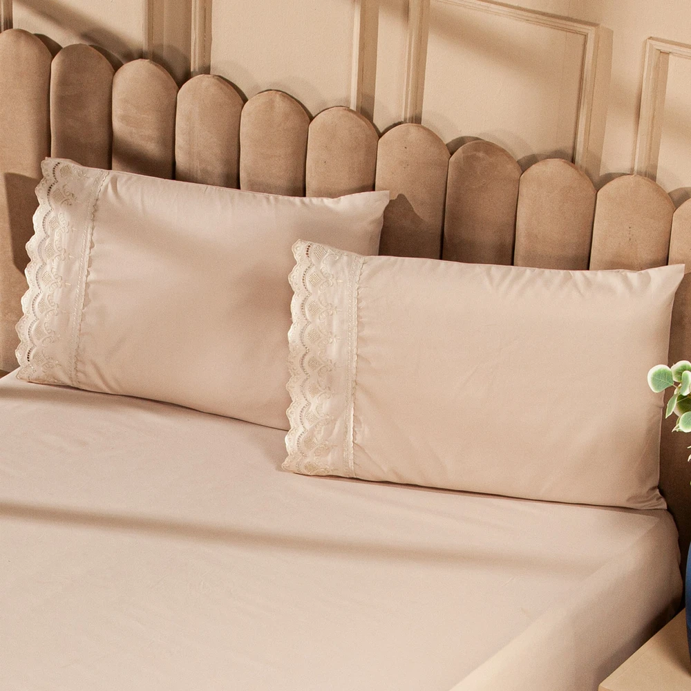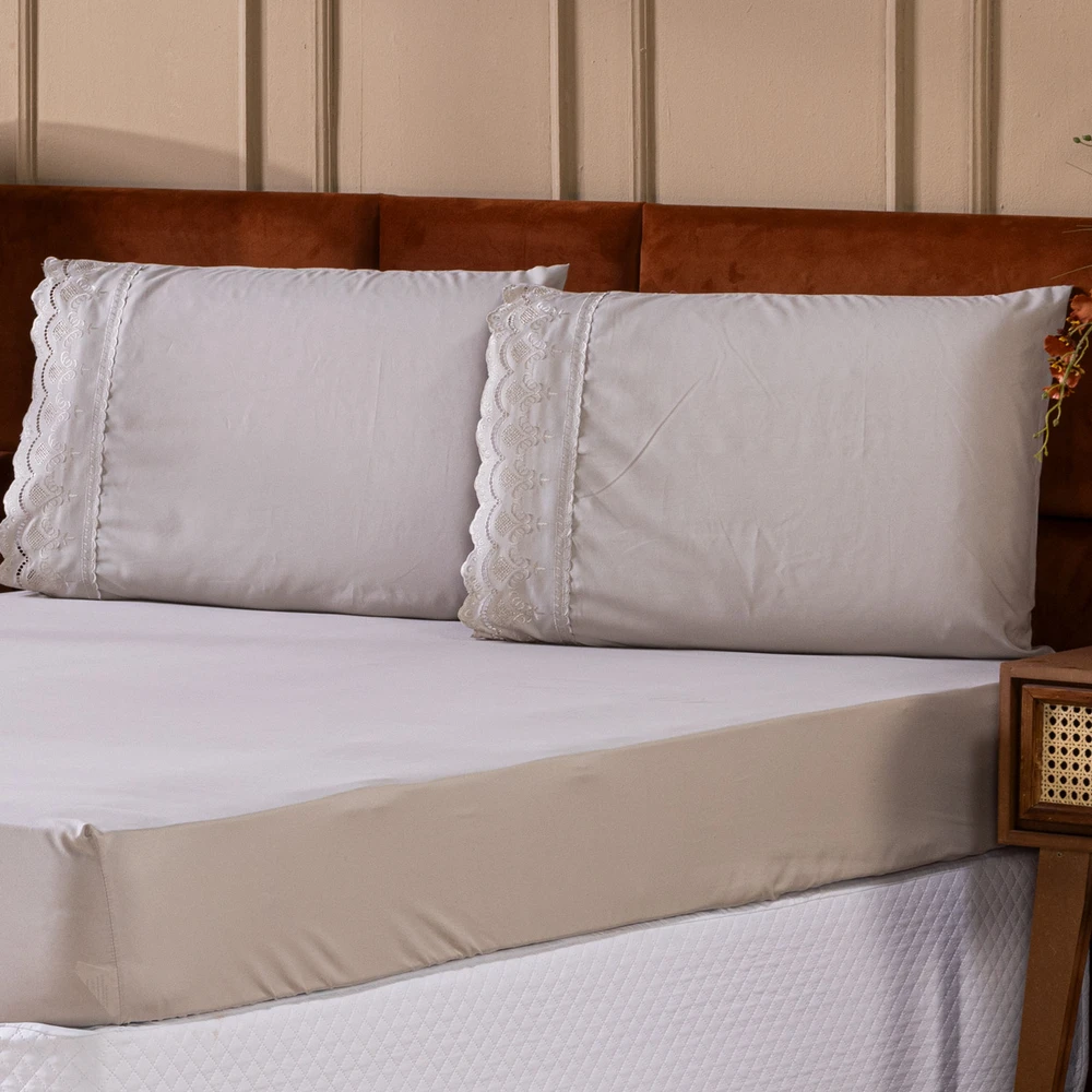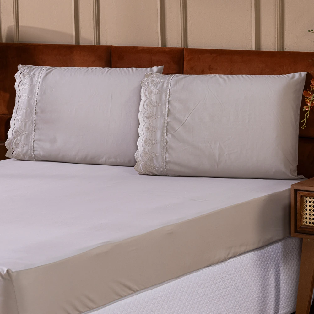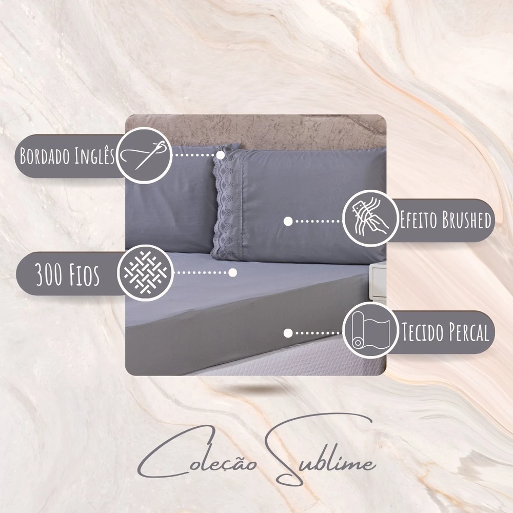 O Jogo de Cama Sublime é a escolha perfeita para quem busca elegância e conforto em cada detalhe. Confeccionado em Percal 300 Fios juntamente com a tecnologia do efeito Brushed duplamente escovado, oferece um toque acetinado que proporciona uma sensação de suavidade e frescor, ideal para noites de sono relaxantes. O delicado bordado inglês nas fronhas traz um toque de sofisticação ao conjunto, fazendo com que seu quarto ganhe um charme extra. Composto por 1 lençol de baixo com elástico para ajuste perfeito e 2 fronhas com acabamento refinado, esse jogo de lençol é ideal para camas de tamanho casal queen. O toque acetinado confere um brilho suave que adiciona um charme sutil ao ambiente, tornando-o ainda mais acolhedor e elegante. Este conjunto combina a alta qualidade do Percal 300 Fios com a beleza atemporal do bordado inglês, resultando em um produto de alta durabilidade que mantém sua suavidade e aspecto impecáveis após diversas lavagens. Perfeito para quem deseja transformar o quarto em um verdadeiro refúgio de conforto e sofisticação. Confira!