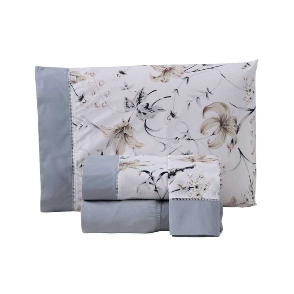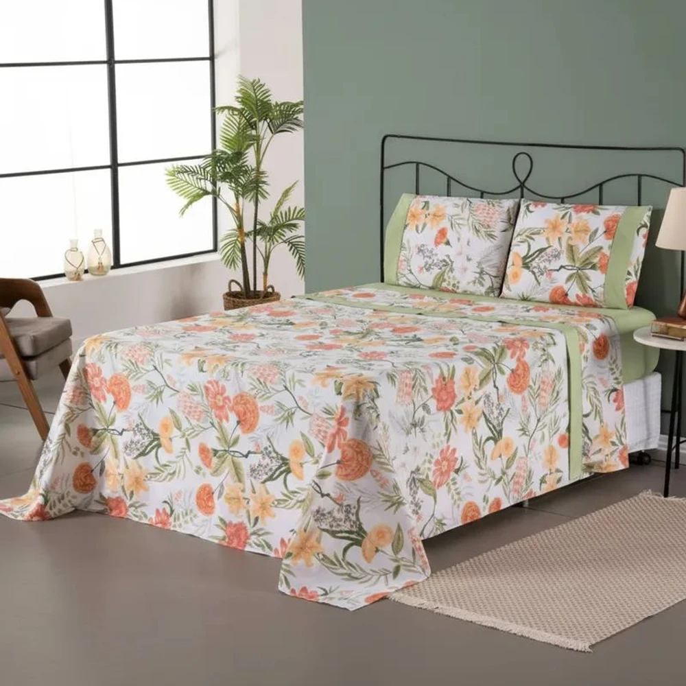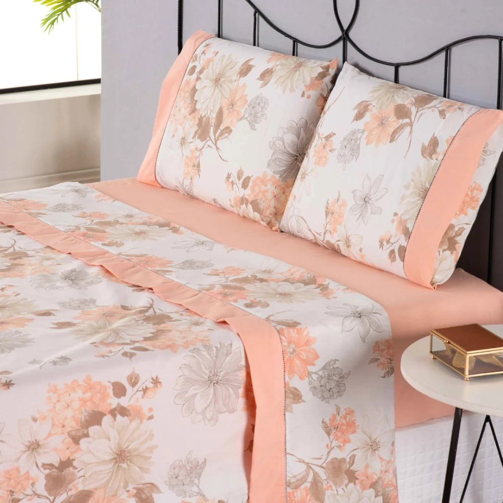 - Conjunto completo com lençol de cima, lençol de baixo com elástico e 2 fronhas