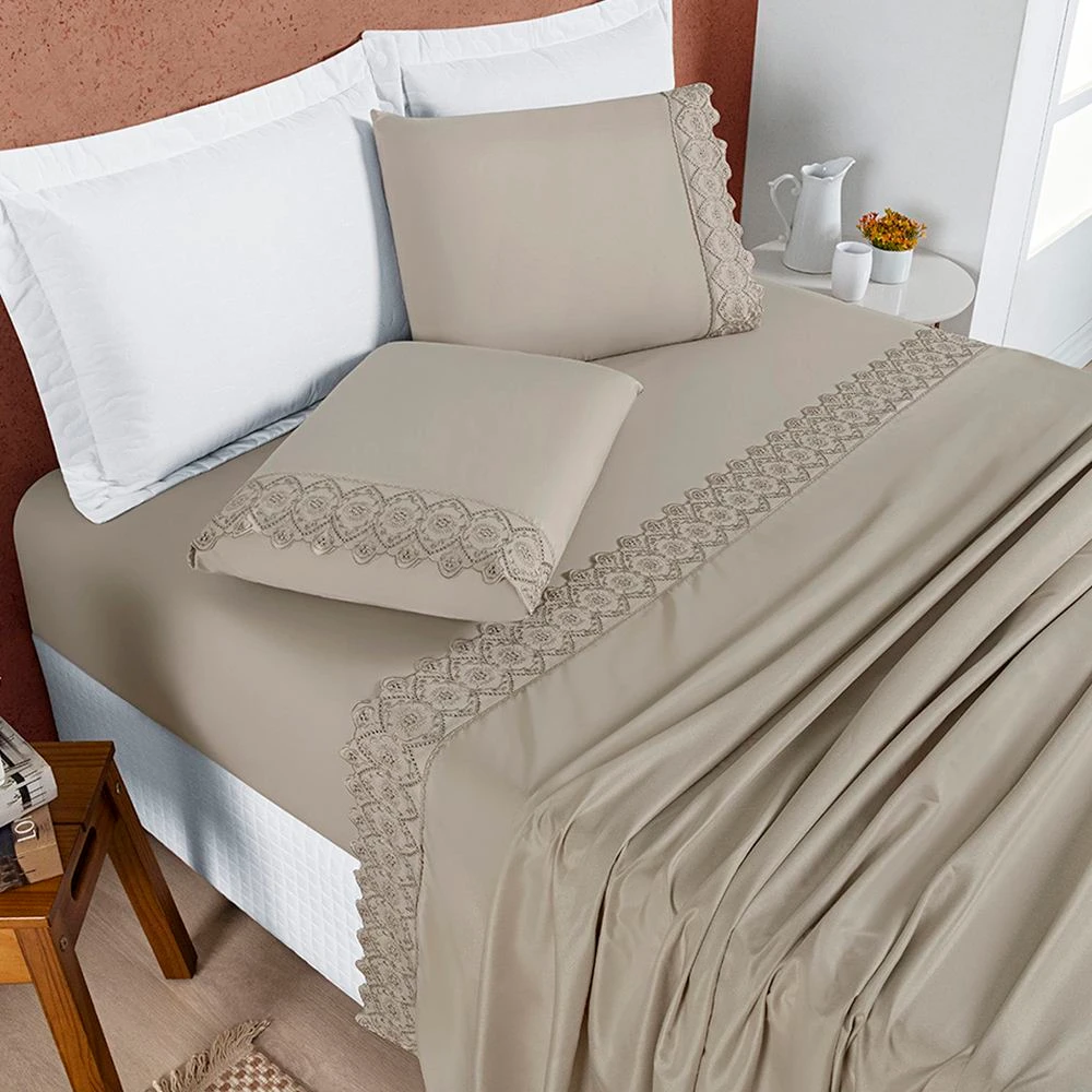 Jogo de Lençol Casal Nobless Bordado Micropercal 200 Fios Toque de Algodão 4 Peças - Taupe
