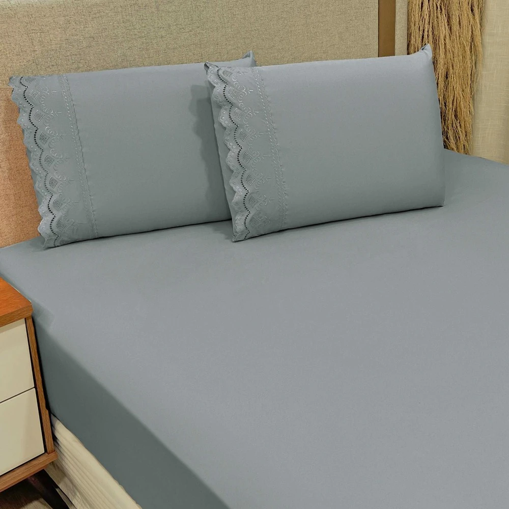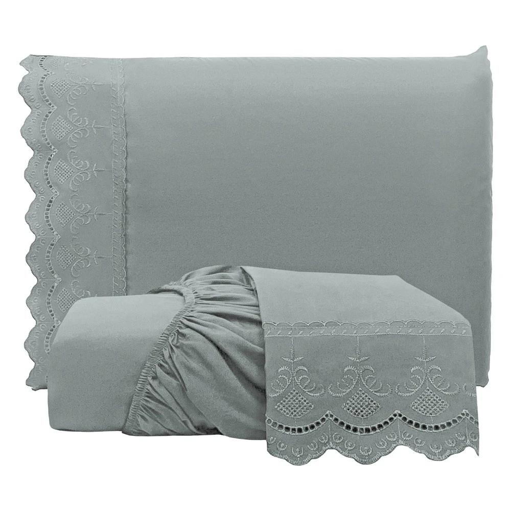 Jogo de Lençol Casal Padrão Bordado Ingles Micropercal 300 Fios Toque de Algodão 3 Peças - Chumbo