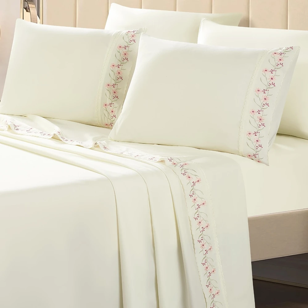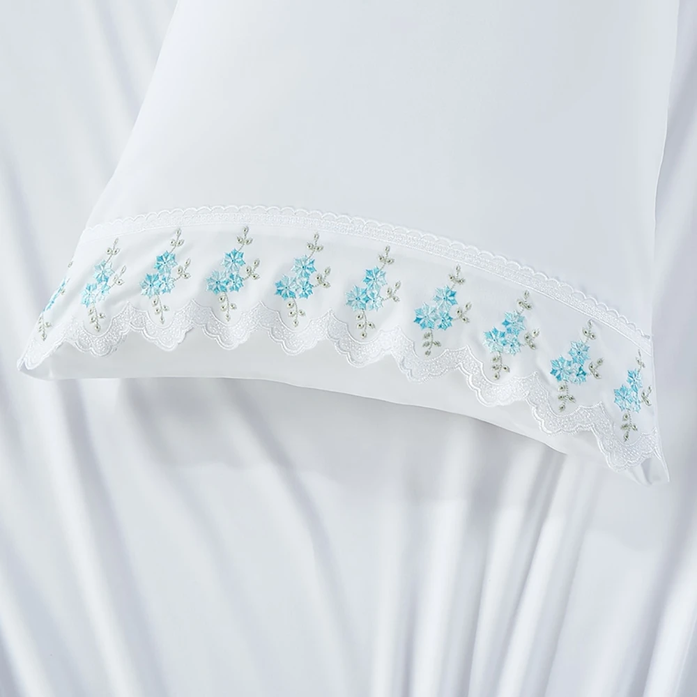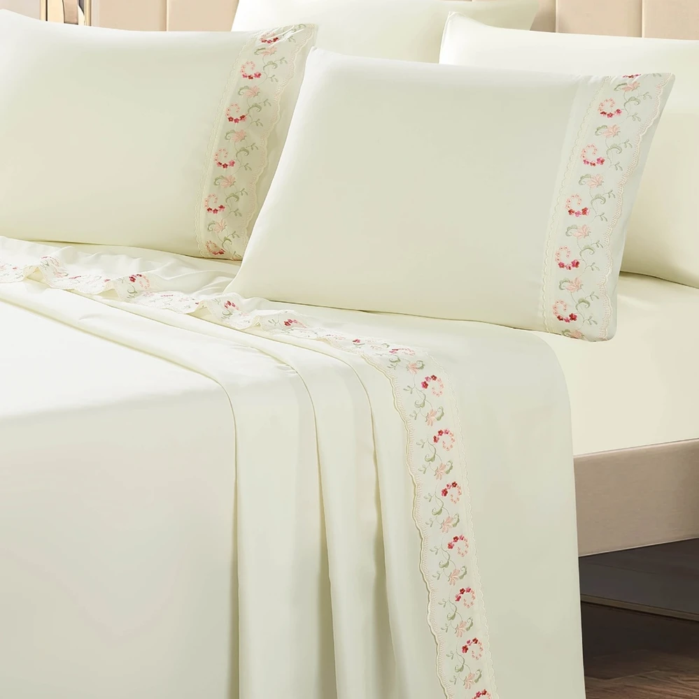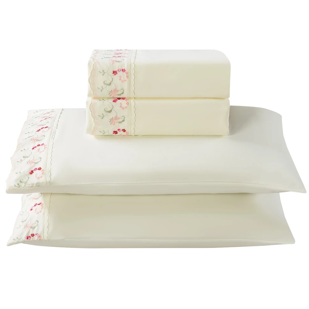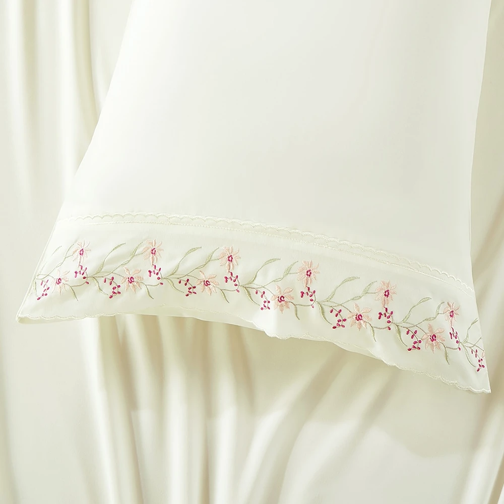 O destaque fica por conta do bordado floral delicado, com acabamento refinado e tonalidades suaves, que acrescenta charme e elegância à composição da cama. Um detalhe sutil, pensado para quem aprecia sofisticação atemporal e ambientes claros e harmoniosos.
