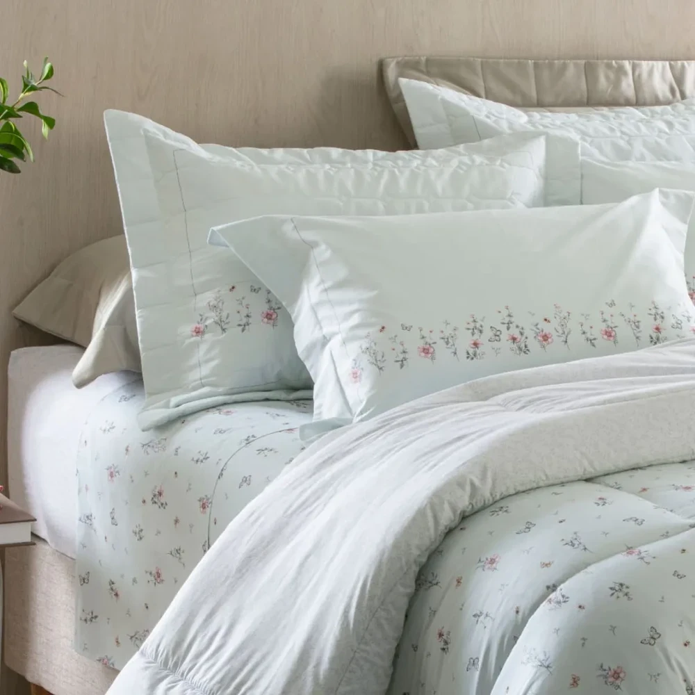 Modo de uso: Ajustar o lençol com elástico sobre o colchão, posicionar o lençol simples e as fronhas correspondentes.