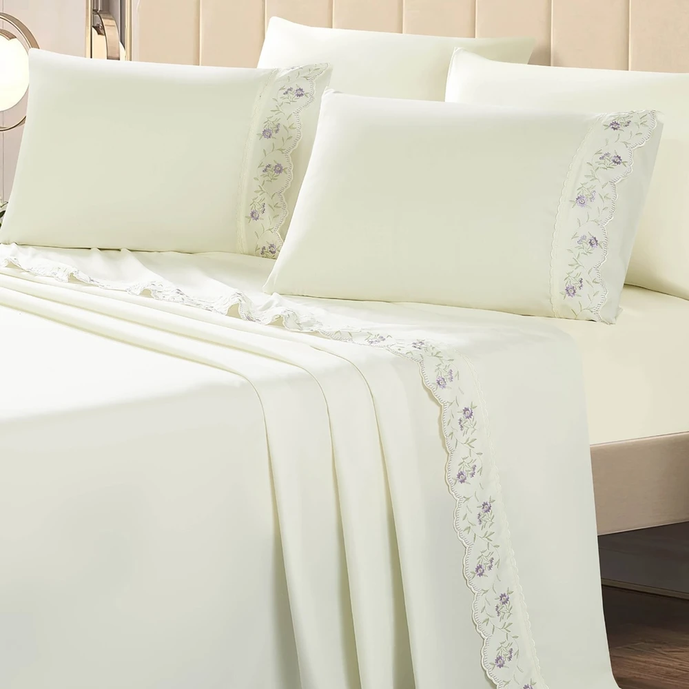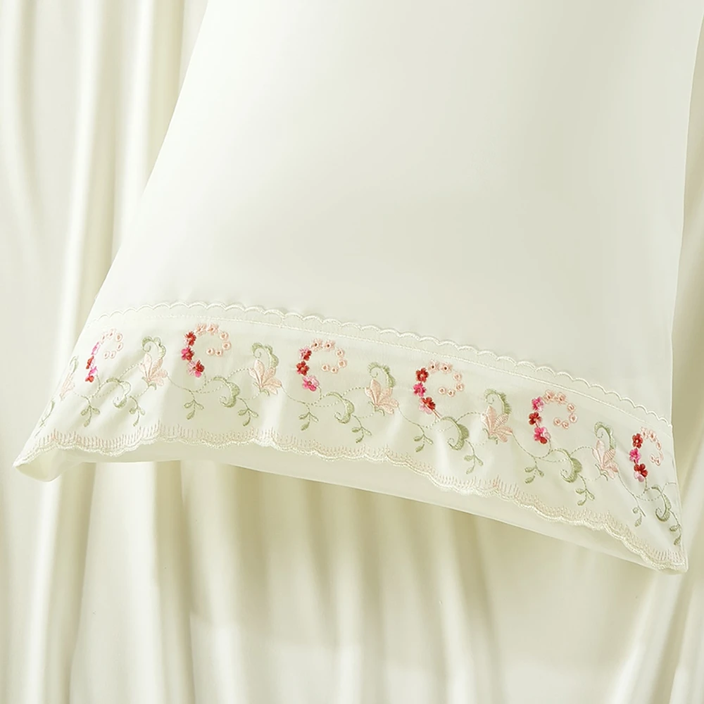 O destaque fica por conta do bordado floral delicado, com acabamento refinado e tonalidades suaves, que acrescenta charme e elegância à composição da cama. Um detalhe sutil, pensado para quem aprecia sofisticação atemporal e ambientes claros e harmoniosos.