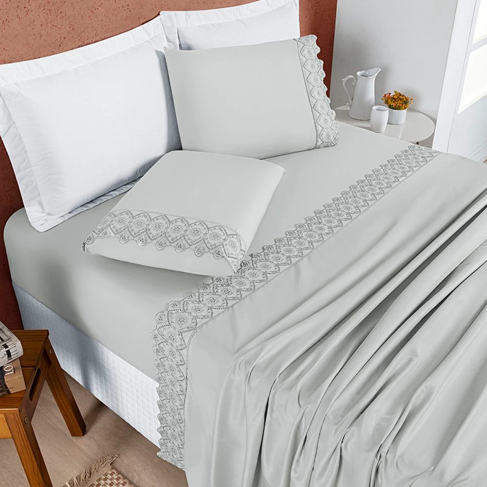 Jogo de Lençol Queen Nobless Bordado Micropercal 200 Fios Toque de Algodão 4 Peças - Cinza Geada