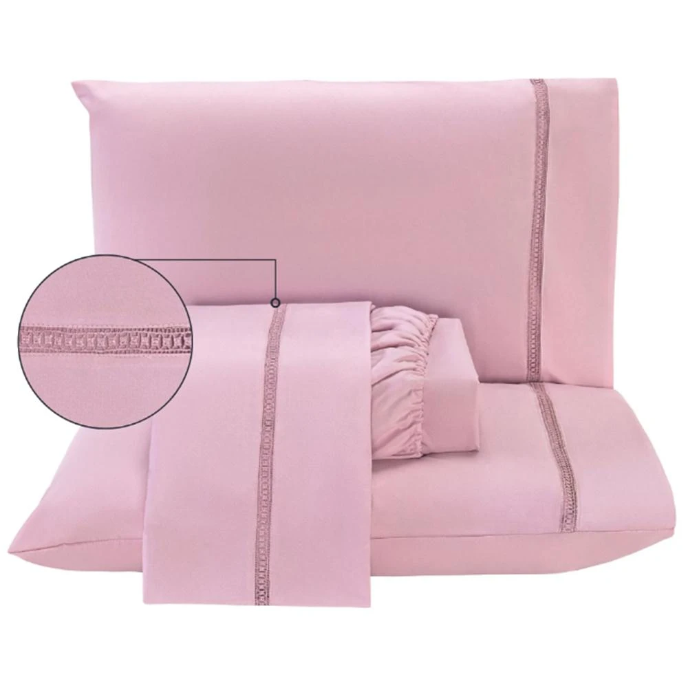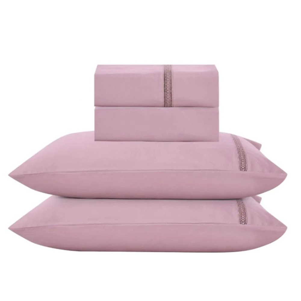 O design elegante traz um bordado refinado aplicado delicadamente nas fronhas e no lençol de cima. O detalhe adiciona um charme sofisticado e atemporal à composição da cama, perfeito para quem aprecia elegância nos mínimos detalhes.