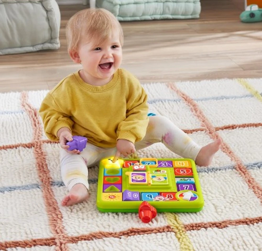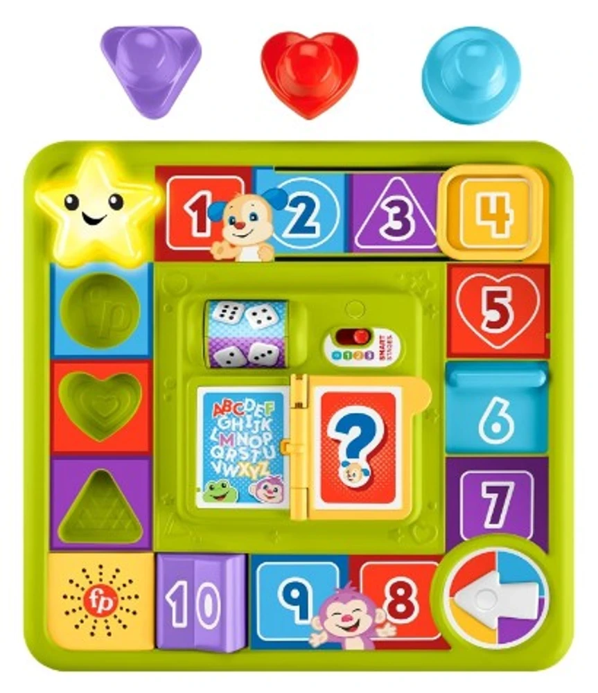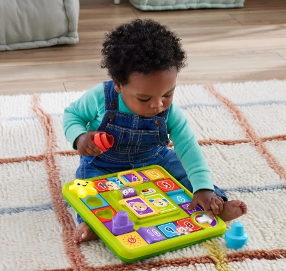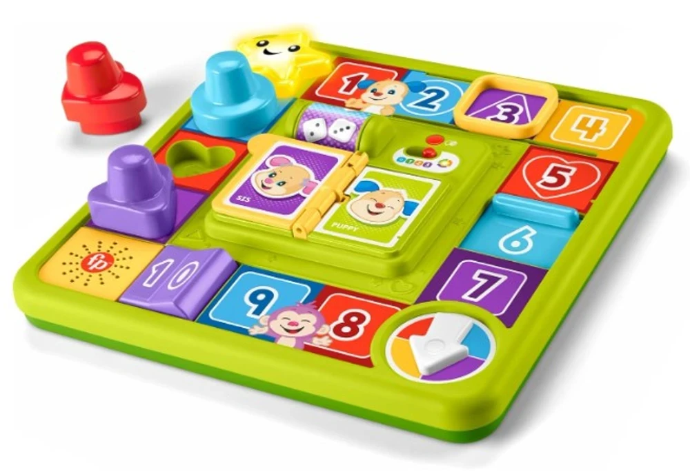 Brinquedo de tabuleiro interativo com 3 pontos de brincar que ativam luzes divertidas, música e canções e frases de aprendizado.