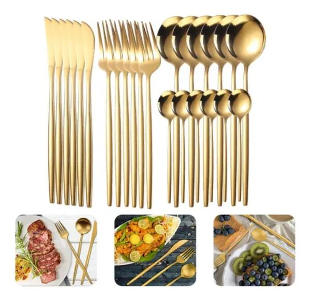 Conjunto de talheres de 24 peças, incluindo 6 colheres, 6 facas, 6 garfos, 6 colheres de chá; um must have para uma cozinha totalmente equipada. Tenha um ótimo jantar com a sua família ou amigos.