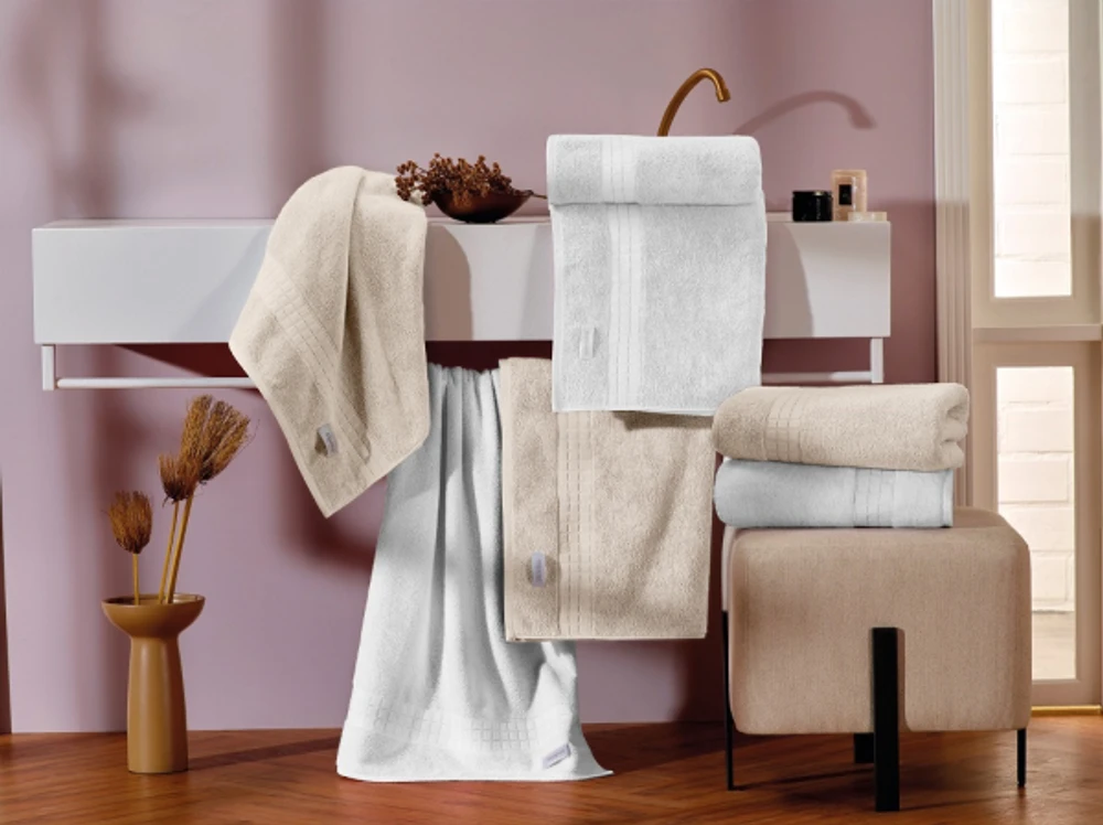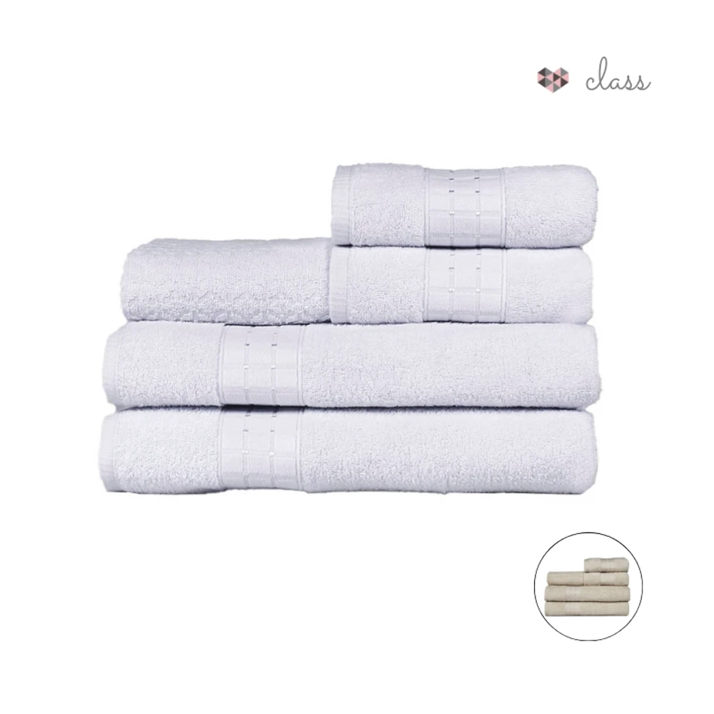 Os Jogos de Banho Class são produzidos em cores neutras,corpo liso e uma linda barra decorativa em estilo clássico.