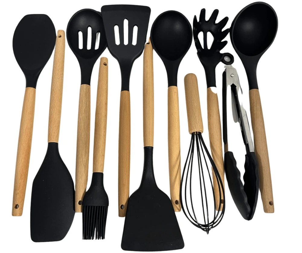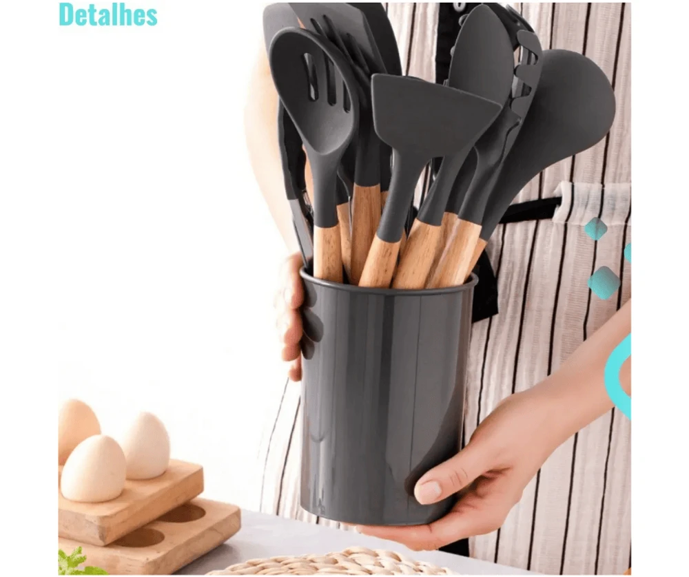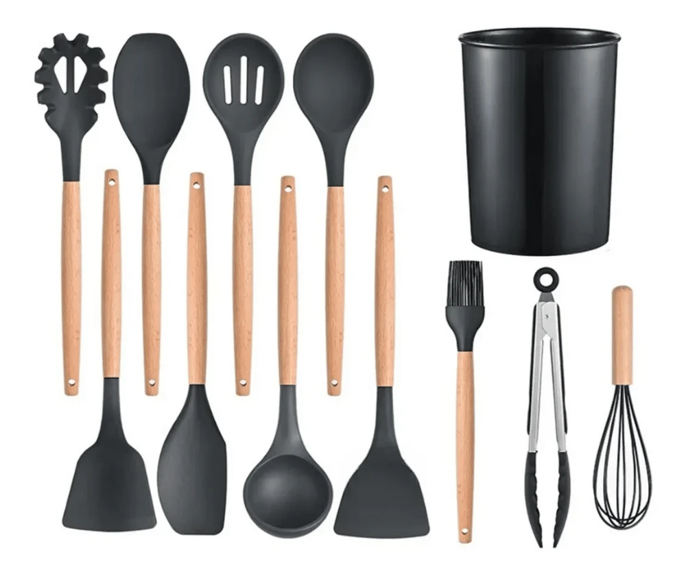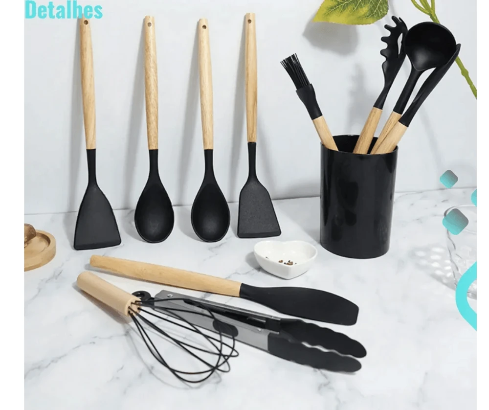 Kit Utensílios de Cozinha 12 Peças em Silicone com Cabo de Madeira COR PRETO