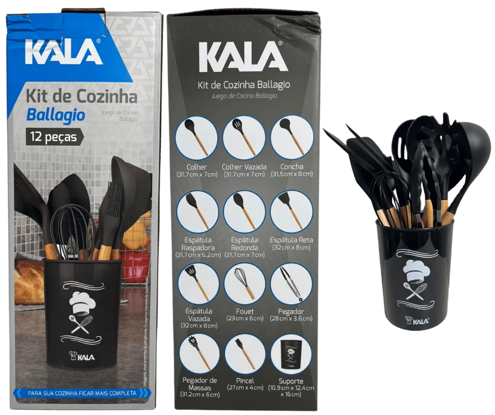 • Inclui:Concha, escumadeira, espátula sólida, espátula vazada, espátula reta, espátula para bolo, pegador de massas, pincel culinário, batedor de ovos (fouet), pinça de cozinha, colher de servir + suporte.