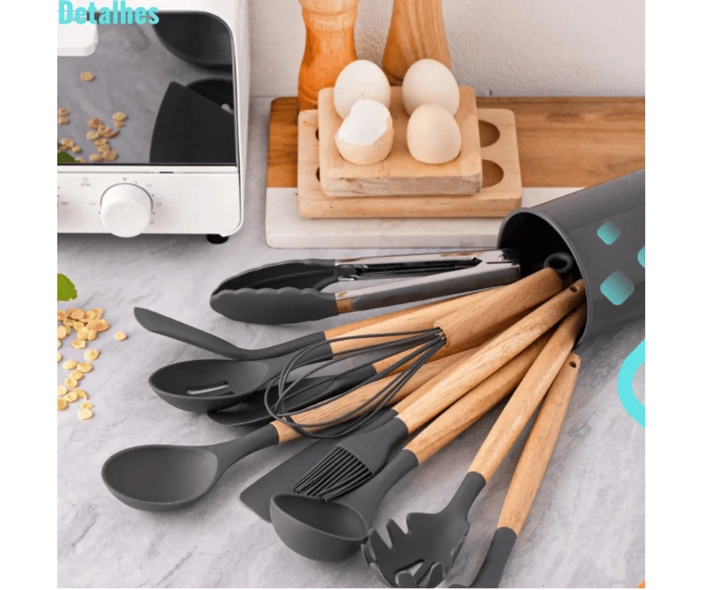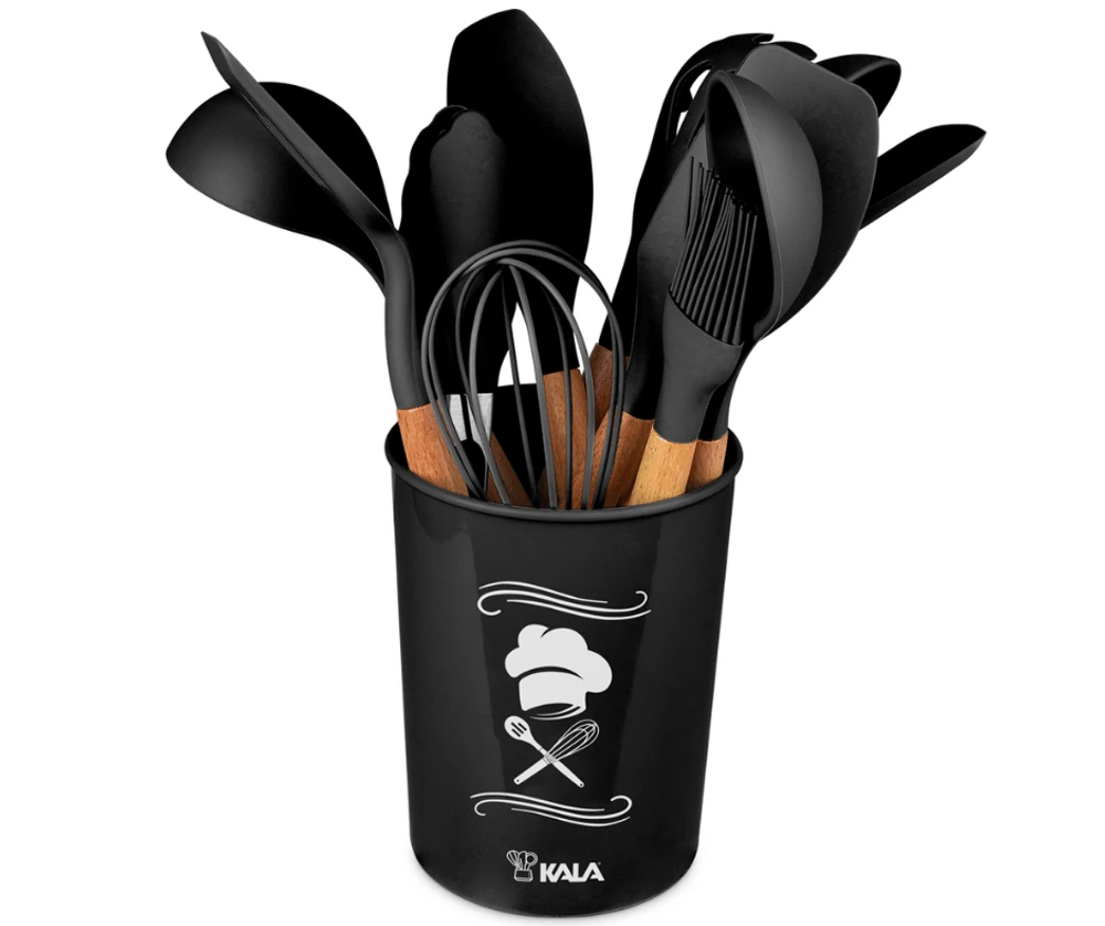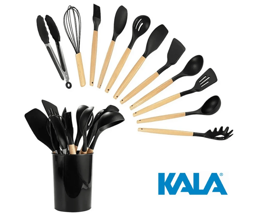 Apresentamos o nosso Kit de Utensílios de Cozinha da Kala,que une a praticidade do silicone com a beleza e o conforto dos cabos de madeira.