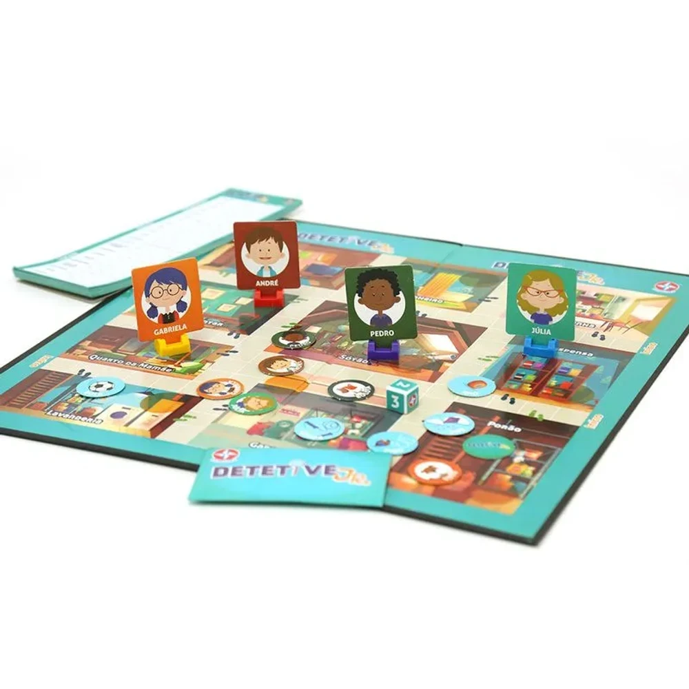 Mistério, pistas e diversão! O Jogo Detetive Jr da Estrela é uma versão adaptada para os pequenos do clássico jogo de investigação. Nele, as crianças assumem o papel de pequenos detetives e usam a lógica para descobrir quem cometeu o crime, onde e com qual objeto. Uma brincadeira envolvente que estimula o raciocínio e a atenção aos detalhes.