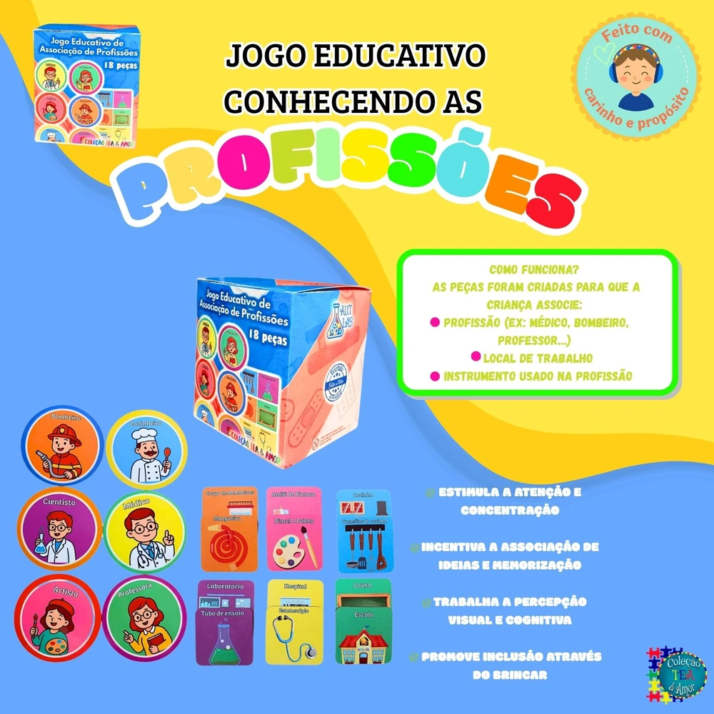 Descobrir o mundo através do brincar pode ser uma experiência mágica, ainda mais quando o jogo é pensado com carinho, cuidado e propósito. O Jogo Educativo para Autistas – Conhecendo as Profissões foi desenvolvido para transformar o aprendizado em uma aventura divertida e cheia de descobertas. Ele é composto por 18 peças bem coloridas e resistentes, criadas para que a criança associe a profissão ao seu instrumento de trabalho e ao local onde ela acontece, explorando seis profissões diferentes que despertam curiosidade e encantamento.