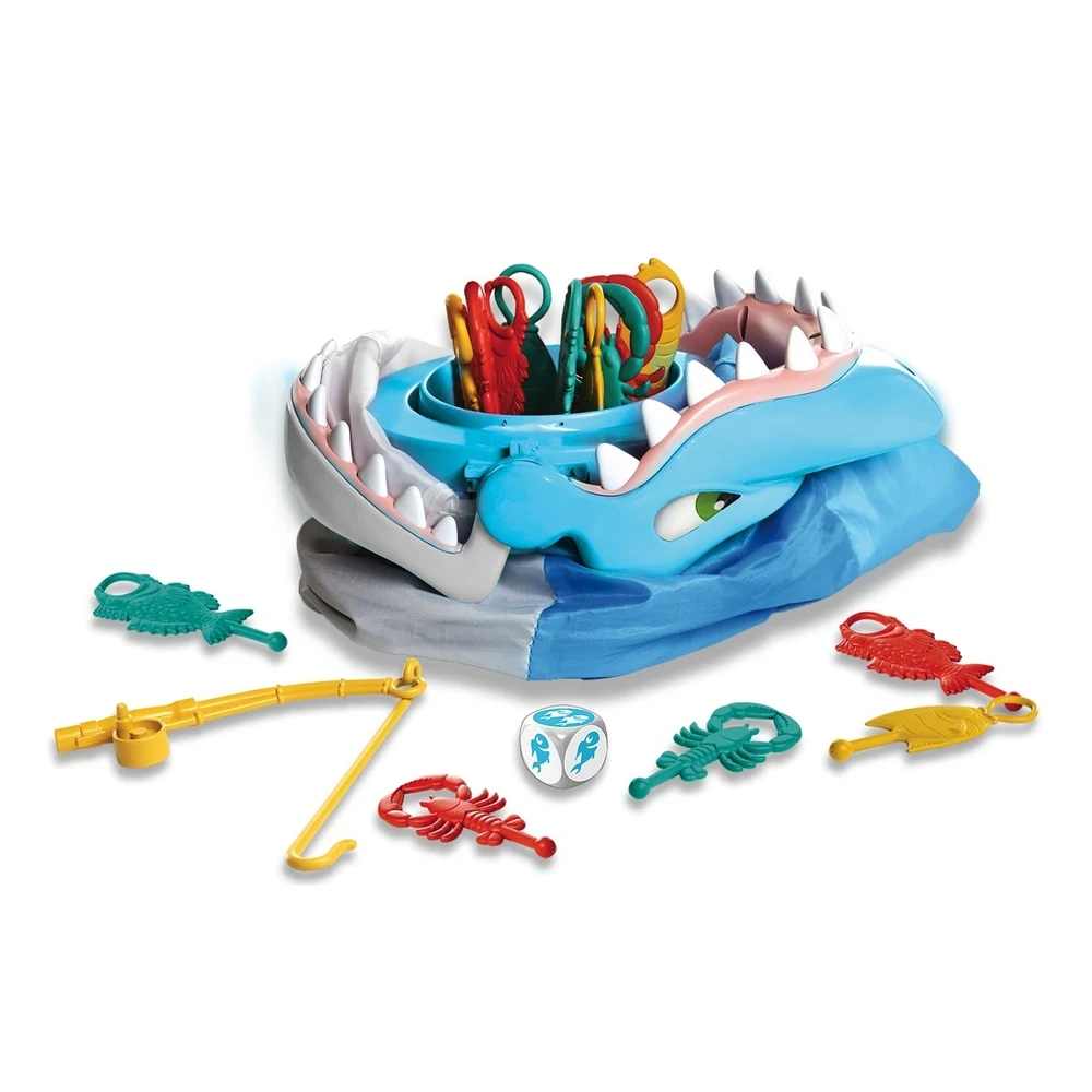 Para jogar, basta lançar o dado: o número sorteado indica quantos peixes você deve retirar da boca do tubarão. Ganha quem tiver mais peixinhos no final, desde que escape das mordidas inesperadas.