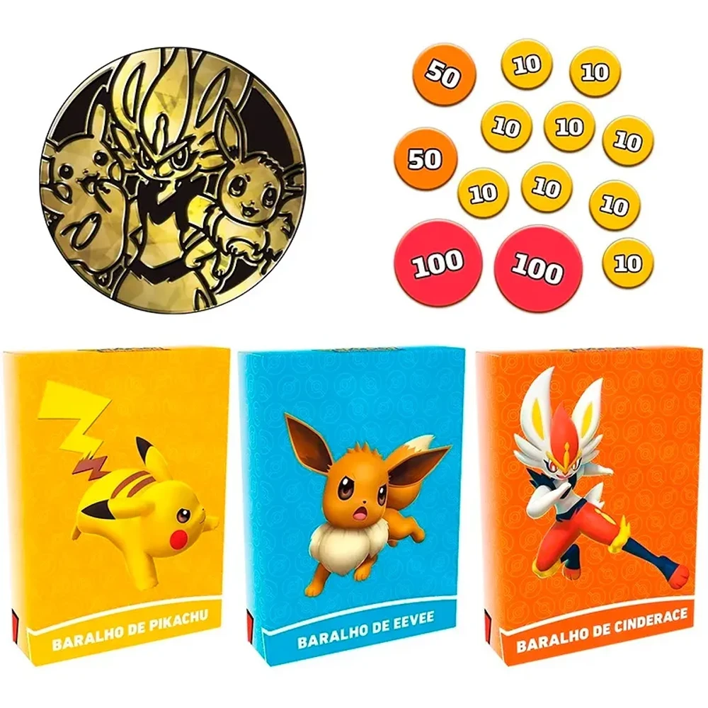 Conteúdo da embalagem: 3 baralhos de 60 cartas (Cinderace V, Pikachu V e Eevee V), 1 carta promocional Obstagoon de Galar, 1 tabuleiro, 3 caixas de baralho, 2 guias de ajuda, 1 folha de instruções, 1 livro de regras, 1 moeda grande metálica, contadores de dano, 1 carta codificada para o novo Pokémon Estampas Ilustradas