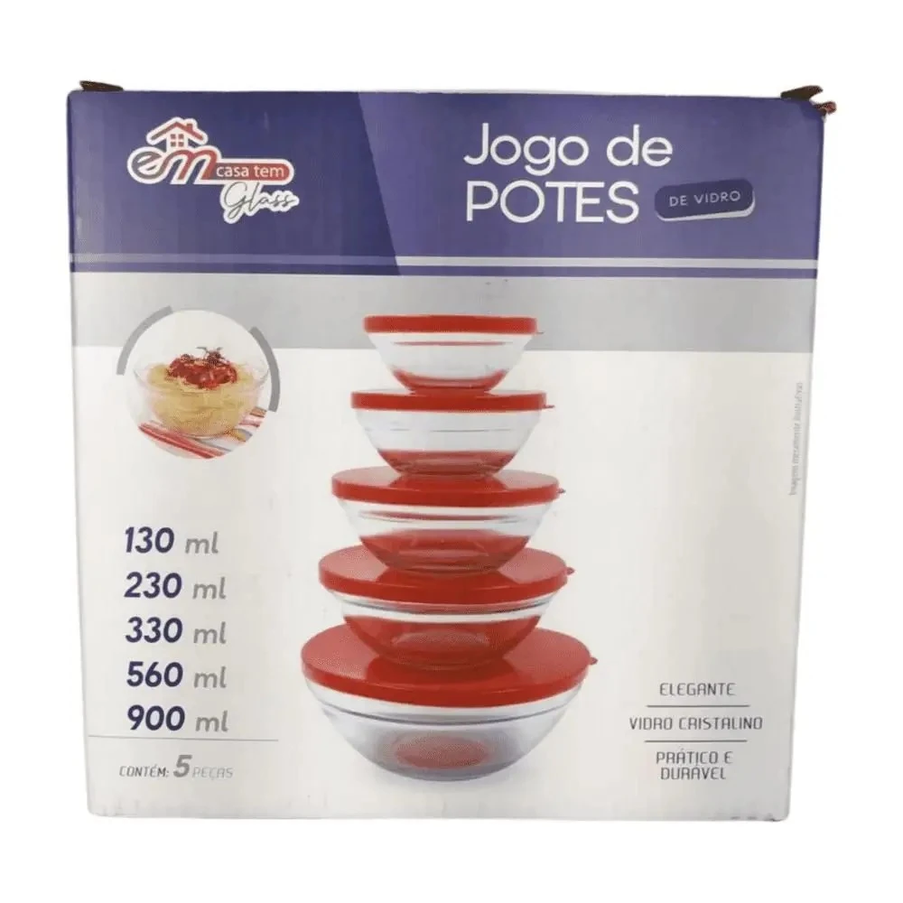 O conjunto de potes da Em Casa Tem foi desenvolvido em vidro resistente para você armazenar os mais variados tipos de alimentos em sua geladeira ou armários. Estes 5 potes têm tamanhos diferentes, comportam diversos alimentos, contam com design moderno e tampa para lacrar as suas refeições com segurança. Podem ser usados na geladeira e até na lava-louças.