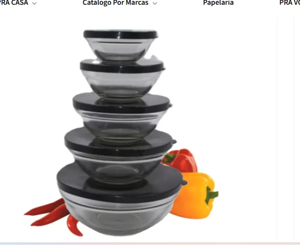Foi identificada uma divergência entre o título do produto "JOGO POTES COM TAMPA 5 PEÇAS BOWL" e as imagens apresentadas. O título menciona potes bowl com tampas, que são potes de vidro redondos com tampas coloridas (preta na primeira imagem e vermelha na segunda). As imagens correspondem ao título, mostrando conjuntos de potes bowl empilhados, com tampas de cores diferentes. Portanto, a descrição será gerada com base nas imagens de potes bowl com tampa.