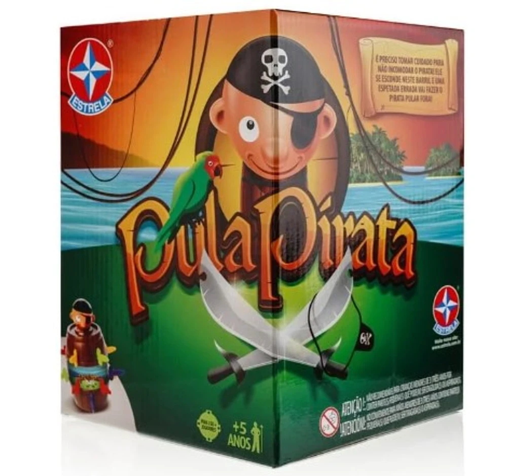 Jogo Pula Pirata Estrela Recomendações: para 2 jogadores ou mais a partir de 5 anos Objetivo do jogo: conseguir colocar o máximo de espadinhas no baú sem fazer o pirata pular Tempo médio de jogo: 15 minutos Jogue com realidade aumentada.