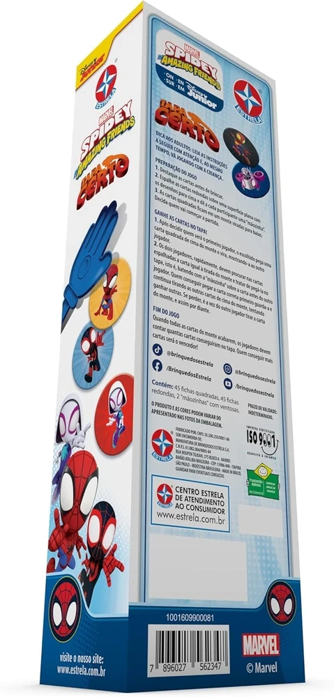 O Jogo Tapa Certo Spidey da Estrela leva a diversão a outro nível com uma dinâmica rápida, divertida e perfeita para brincar em família. Inspirado na turma do Spidey, o jogo estimula a atenção, os reflexos e a percepção visual das crianças, que precisam ser rápidas para identificar as cartas certas e dar o famoso “tapa” antes dos outros jogadores. Leve e fácil de jogar, transforma qualquer momento em uma brincadeira animada e cheia de risadas.
