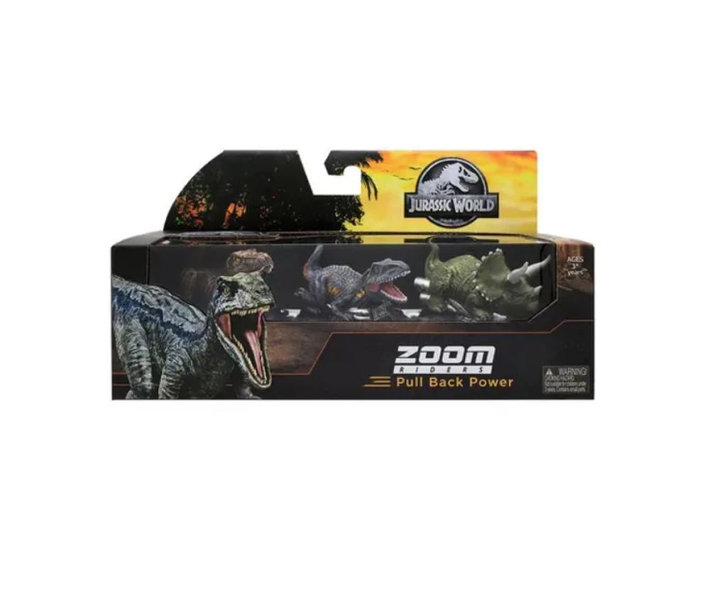 pack com 3 carrinhos Zoom Riders Jurassic World Carrinhos Zoom Riders são carros com tração traseira com detalhes épicos O carrinho possui calotas icônicas do Jurassic World - perfeitas para brincar de corrida e batalha