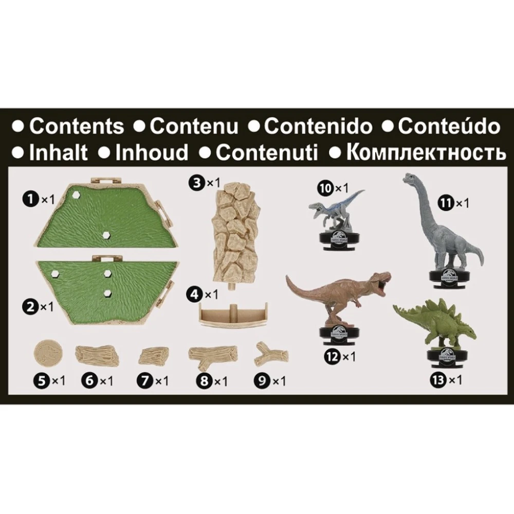 O pacote contém 4 figuras de dinossauros diferentes, 4 ramos diferentes, 1 moeda, 2 placas de base, 1 pilar, 1 conector e 4 pés.