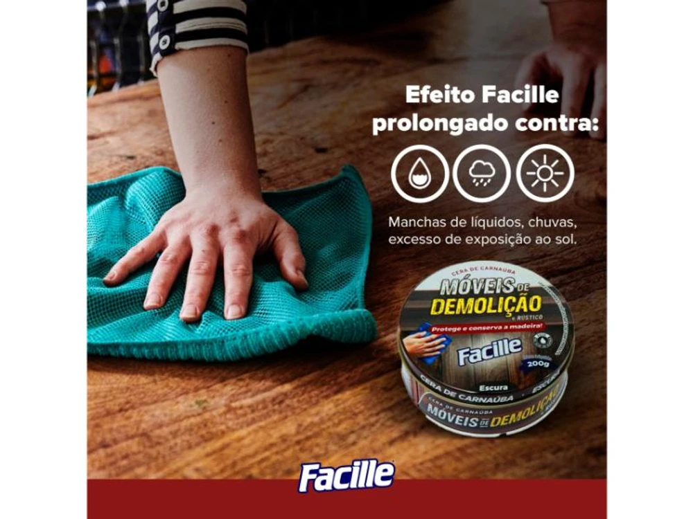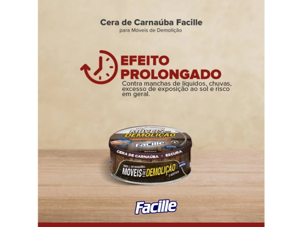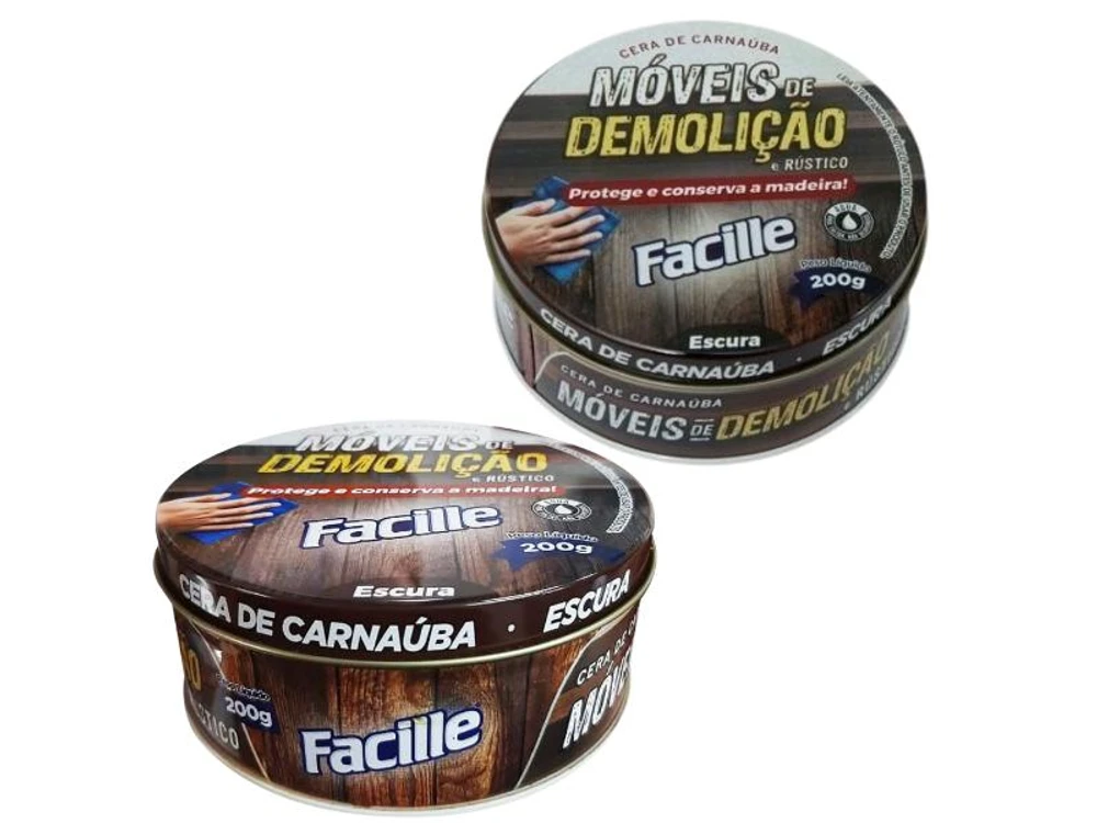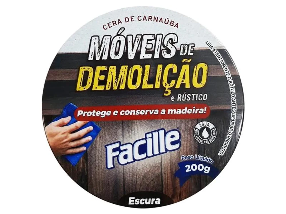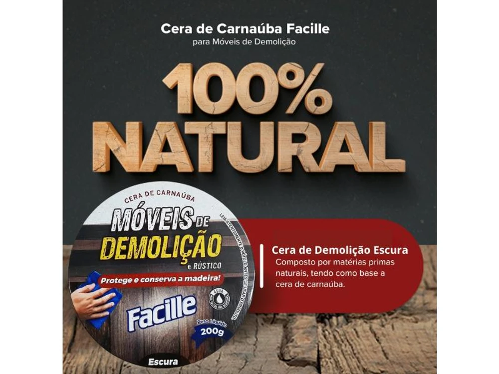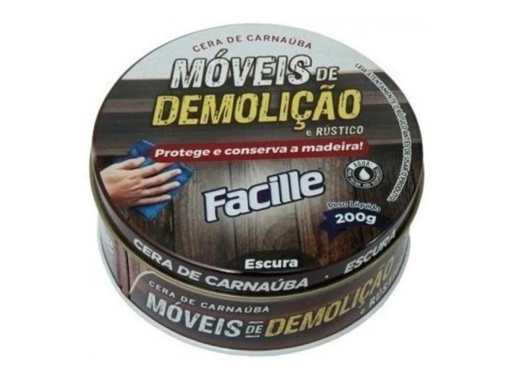 Cera de Carnaúba para Móveis de Demolição e Rústico 200g O produto é composto por matérias primas naturais, tendo como base a cera de carnaúba que cria uma camada protetora conservando o aspecto natural da madeira por mais tempo. Fácil aplicação e efeito prolongado contra manchas de líquidos, chuvas, excesso de exposição ao sol e risco em geral