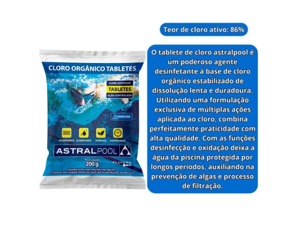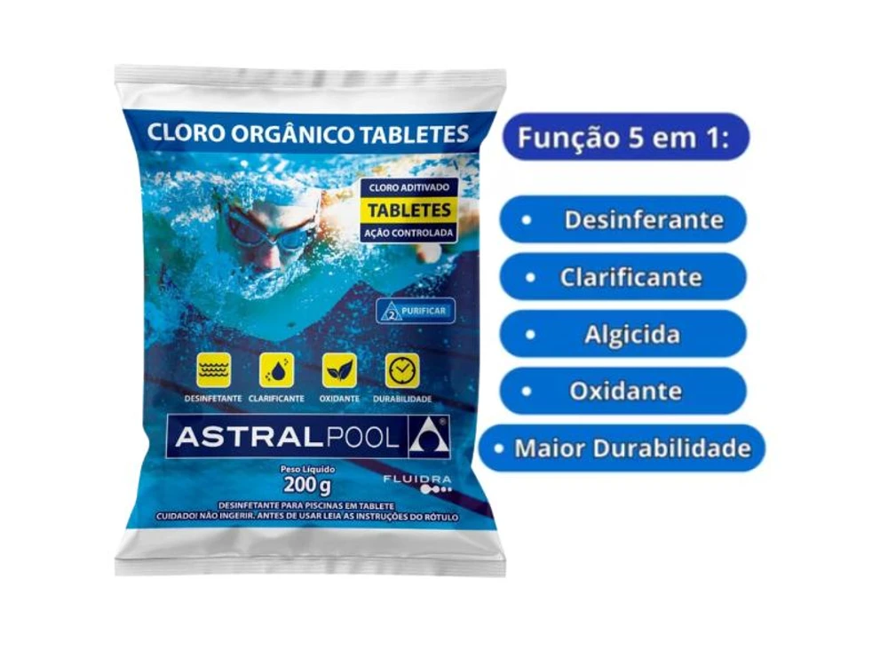 O cloro orgânico tabletes astrapool é um poderoso agente desinftante à base de cloro orgânico estabilizado. Utilizando uma formulação exclusiva de múltiplas ações aplicada ao cloro, combina perfeitamente praticidade com alta qualidade. Através das funções como desinfecção e oxidação deixa a água da piscina protegida por longos períodos, auxiliando na prevenção de algas e processo de filtração.