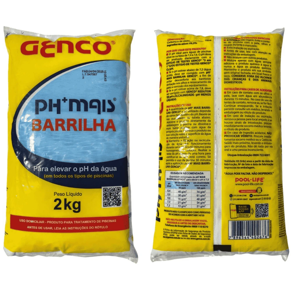 1) A quantidade de pH® MAIS BARRILHA GENCO® a ser utilizada depende de vários fatores além do pH. Baseie-se nas quantidades indicadas na tabela que consta nas imagens do produto.