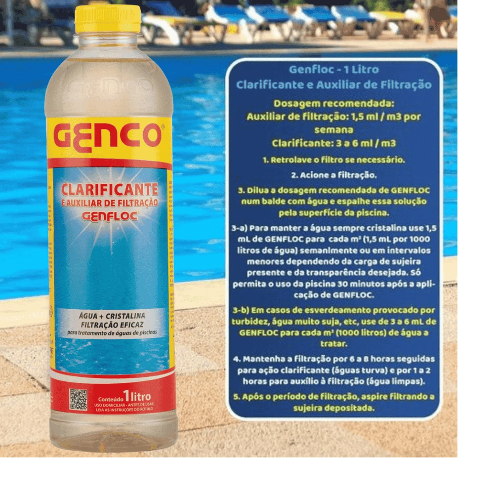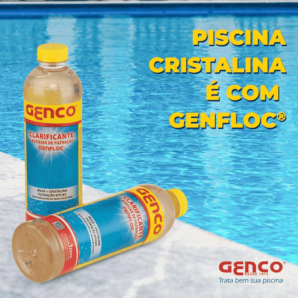 GENFLOC Clarificante e Auxiliar de Filtração GENCO® é um eficiente clarificante a auxiliar de filtração para águas de piscinas. Sua ação floculante atrai eletrostaticamente as partículas de sujeira que normalmente passariam pelo meio filtrante e forma com elas flóculos grandes que o filtro passa a reter. Isso aumenta o rendimento do filtro. Os flocos maiores e mais pesados decantam para o fundo da piscina de onde podem ser aspirados normalmente. O resultado é a clarificação completa da água.