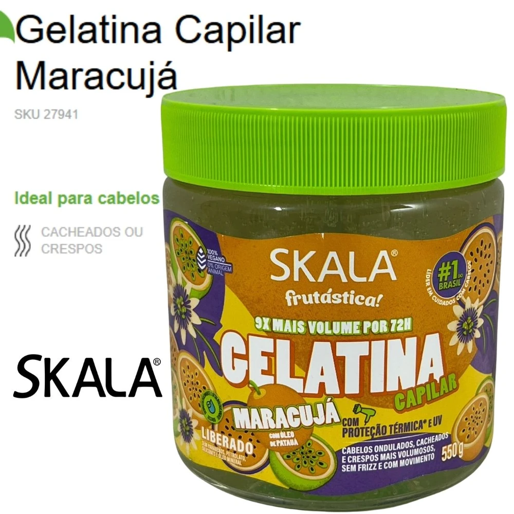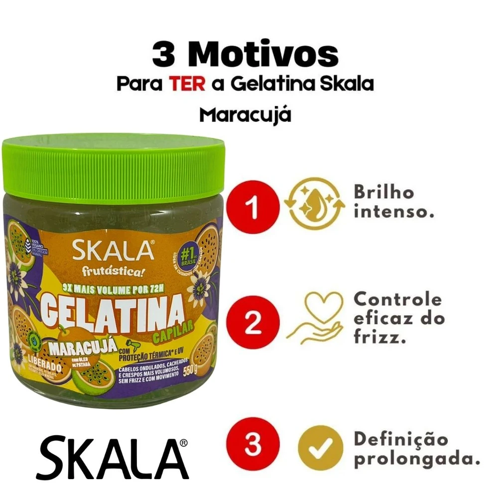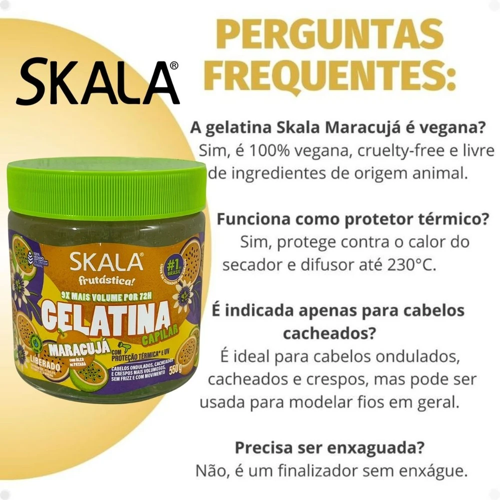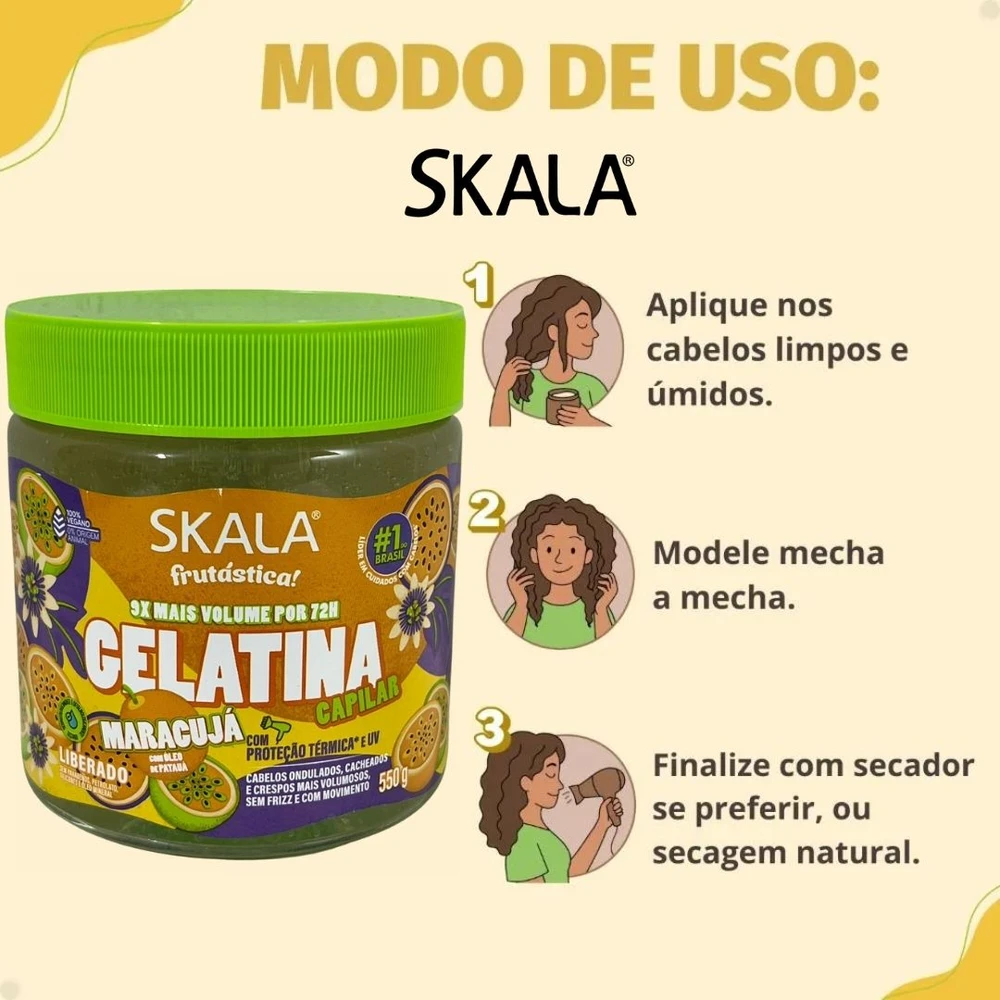 Para a felicidade dos Skalovers, Dona Skala ampliou a rotina de cuidados com a chegada dos finalizadores. A Gelatina Capilar Skala Frutástica Maracujá chegou para dar um toque frutado e divertido à sua rotina de cuidados com os cabelos! Ideal para quem quer dar mais volume e definição especial aos fios.