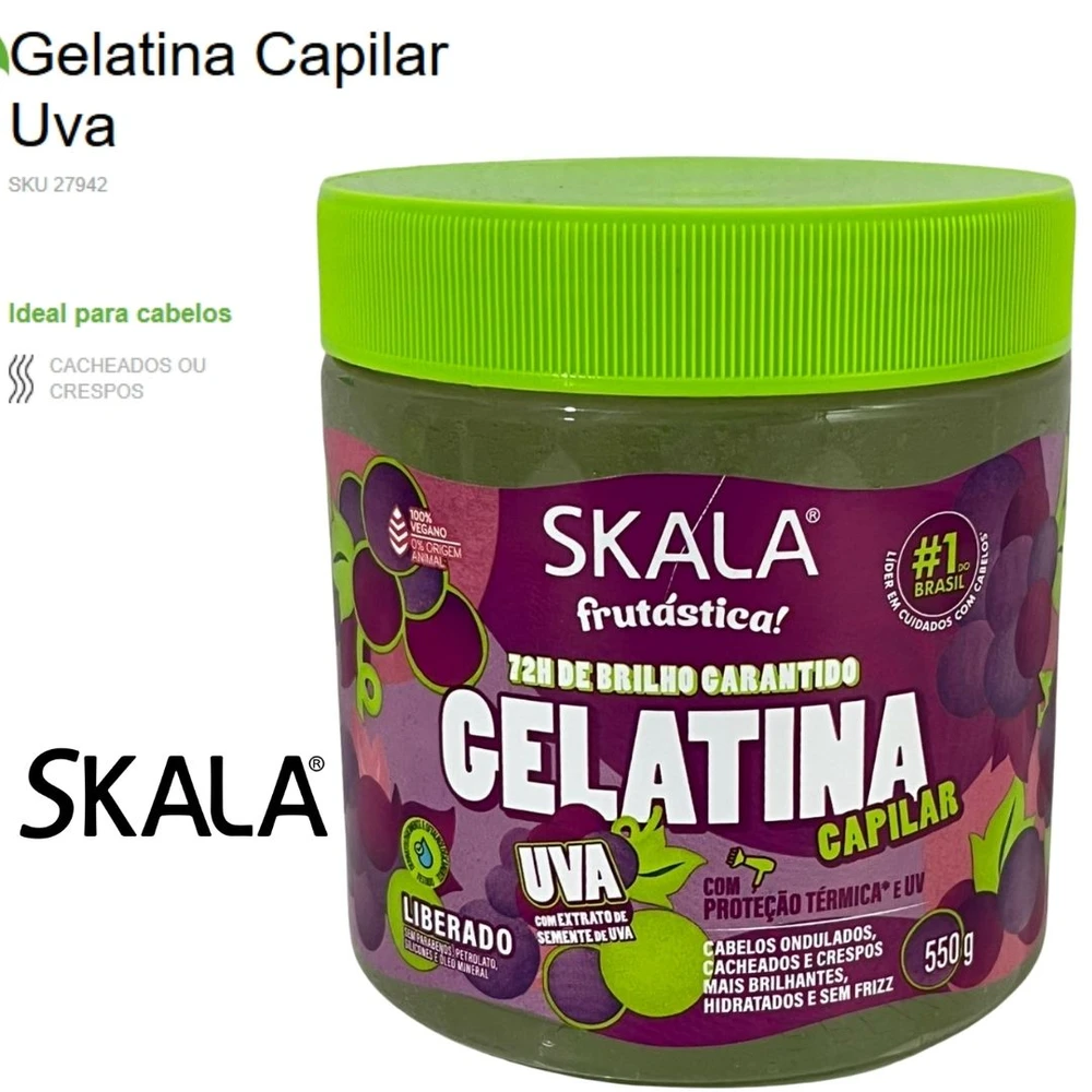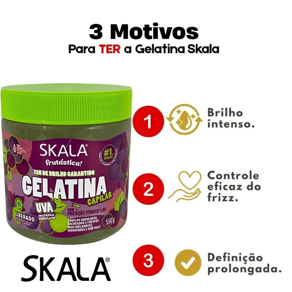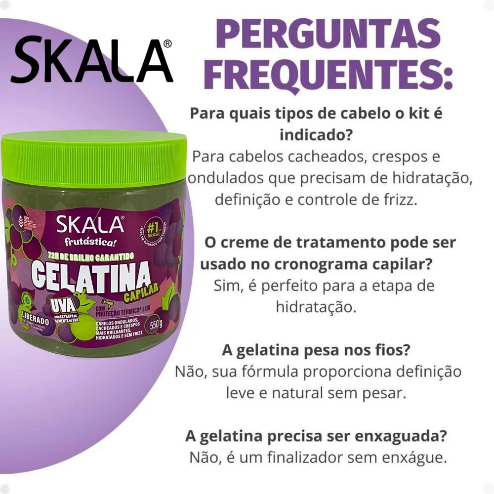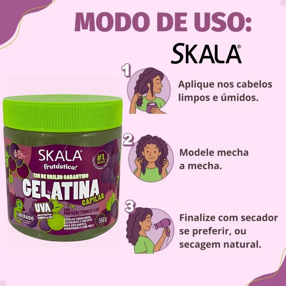 Para a felicidade dos Skalovers, Dona Skala ampliou a rotina de cuidados com a chegada dos finalizadores. A Gelatina Capilar Skala Frutástica Uva chegou para dar um toque frutado e divertido à sua rotina de cuidados com os cabelos! Ideal para quem quer dar mais volume sem pesar e aquela finalização especial aos fios.