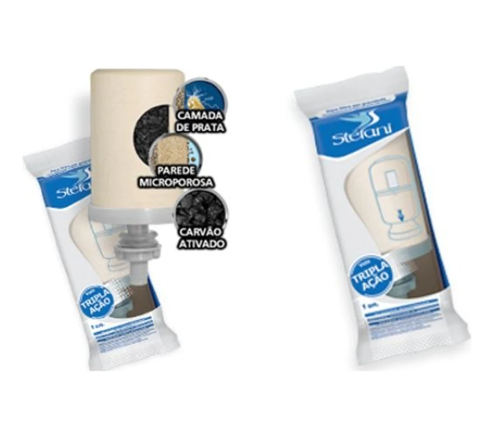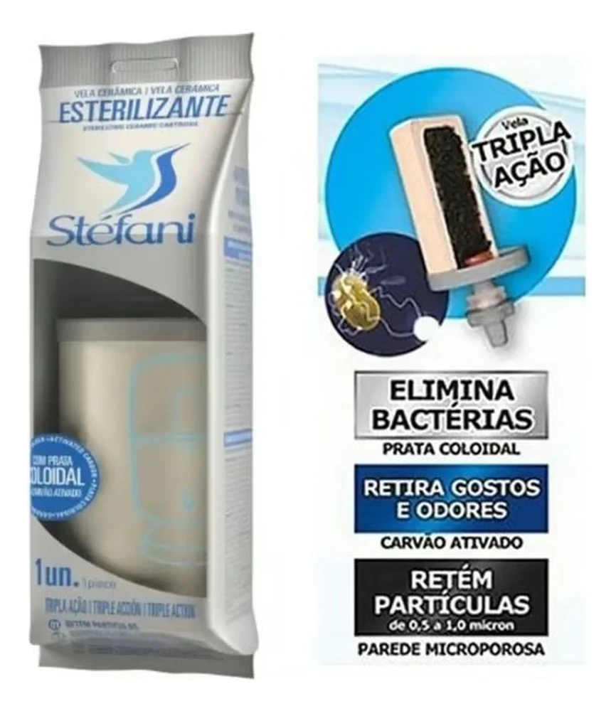 Tripla Ação - Esterilizante, com revestimento de prata coloidal, aplicado na parte interna da vela, junto com o carvão ativado, trabalham para filtrar e reduzir odores, sabores e o teor de cloro, além de reduzir a presença de bactérias da água. A camada de prata aplicada internamente penetra pelos poros da vela, preservando sua propriedade esterilizante.