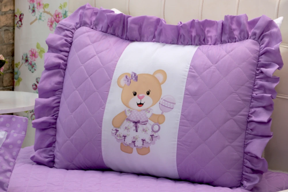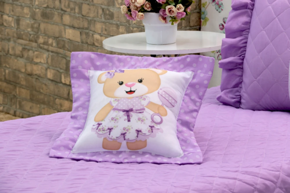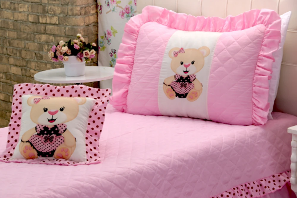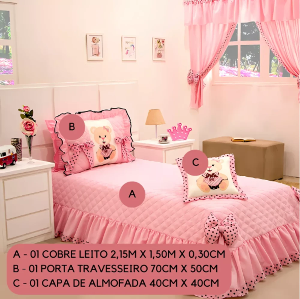 Kit 3 Pçs Cobre Leito Colcha Solteiro Infantil e Juvenil Ursinha com Babados