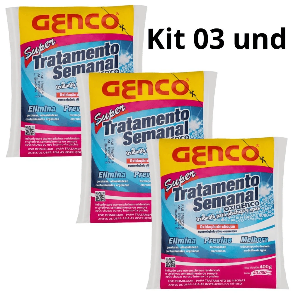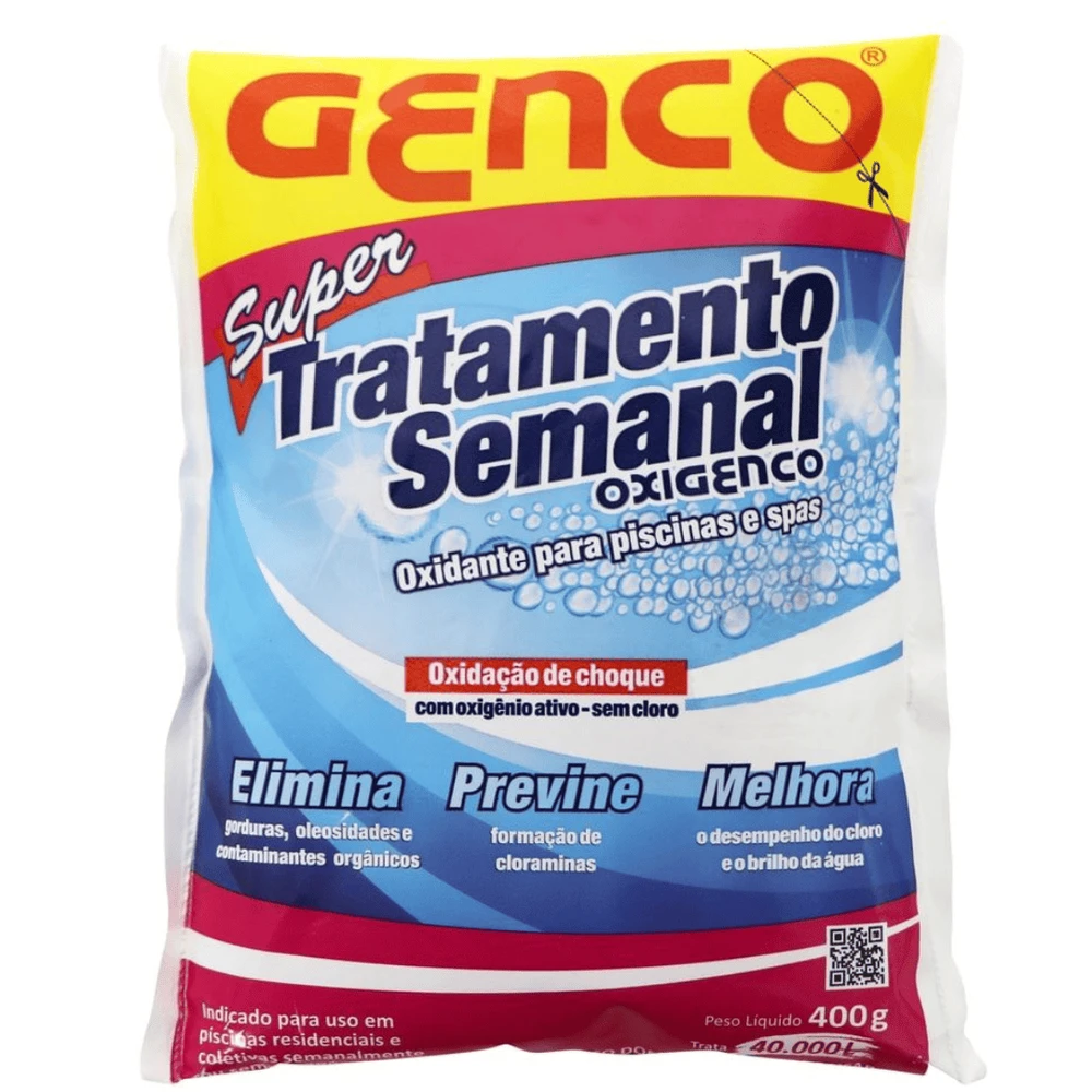 SUPER TRATAMENTO SEMANAL OXIGENCO GENCO® é um agente oxidante para águas de piscinas e spas que utilizam cloro e que necessitam de oxidação frequente para destruir os poluentes que consomem o residual de cloro livre, causam turbidez na água, odores desagradáveis e irritação da pele e dos olhos. Quando o cloro é utilizado para essa tarefa (superclorações), ele agrava o problema gerando cloraminas* antes de oxidá-las, e obriga à interdição da piscina até que seu residual baixe. Realizando oxidação de choque semanalmente com SUPER TRATAMENTO SEMANAL GENCO® a eliminação desses e outros contaminantes orgânicos é feita mais rapidamente, com maior eficácia e o residual de cloro fica livre para a tarefa de desinfecção, na qual é imbatível.