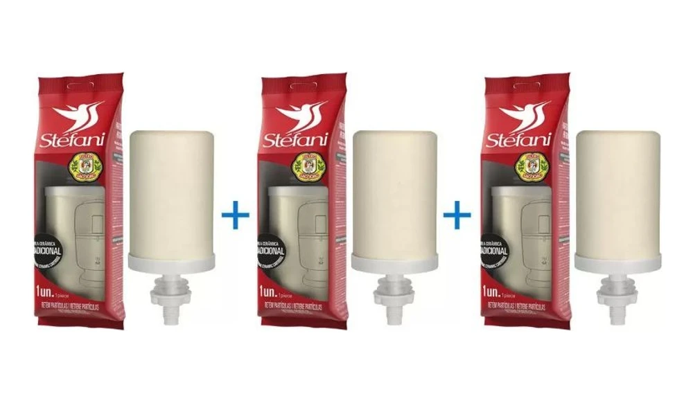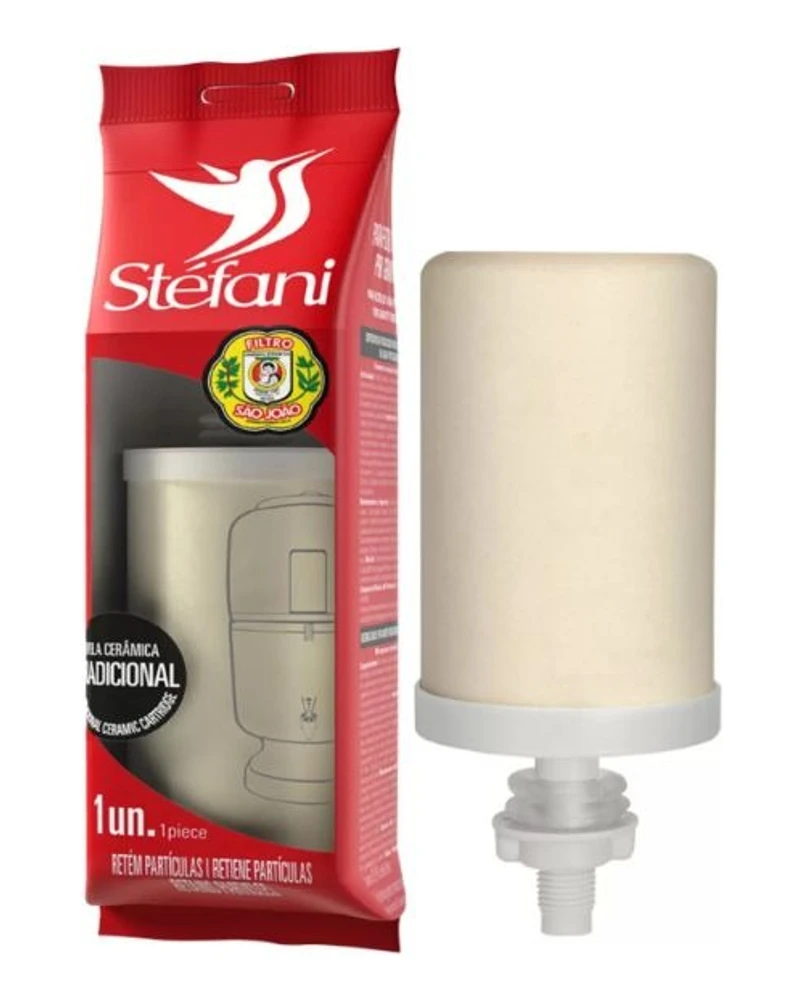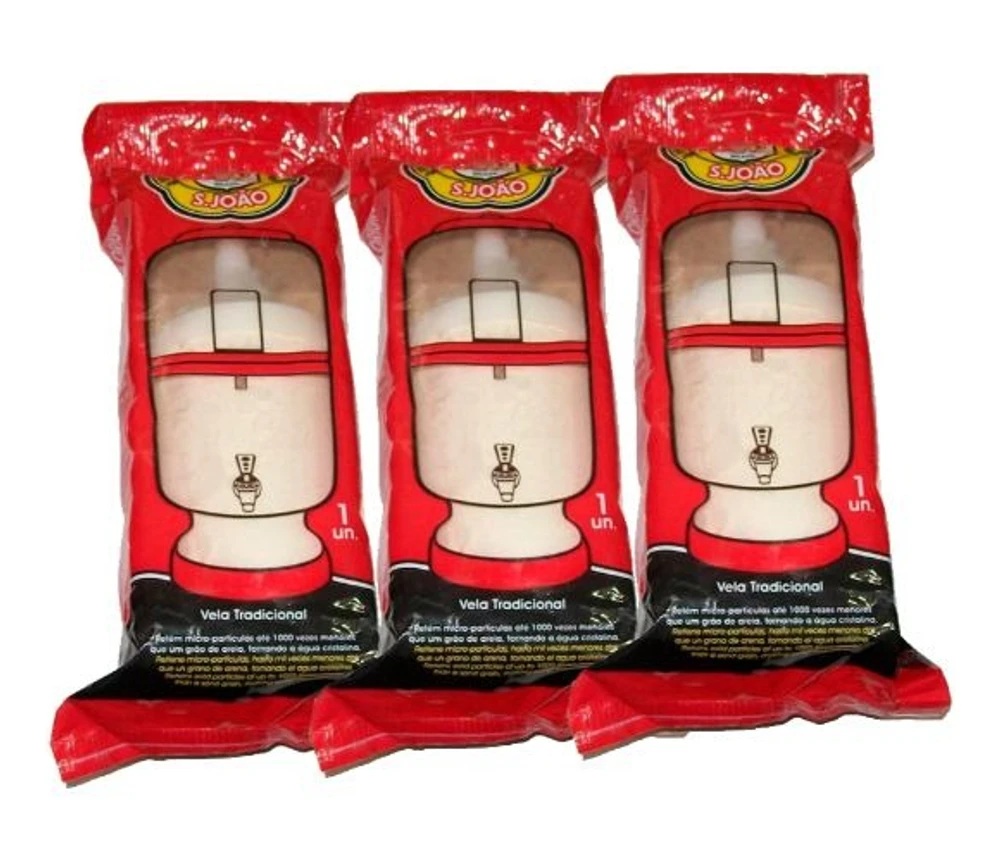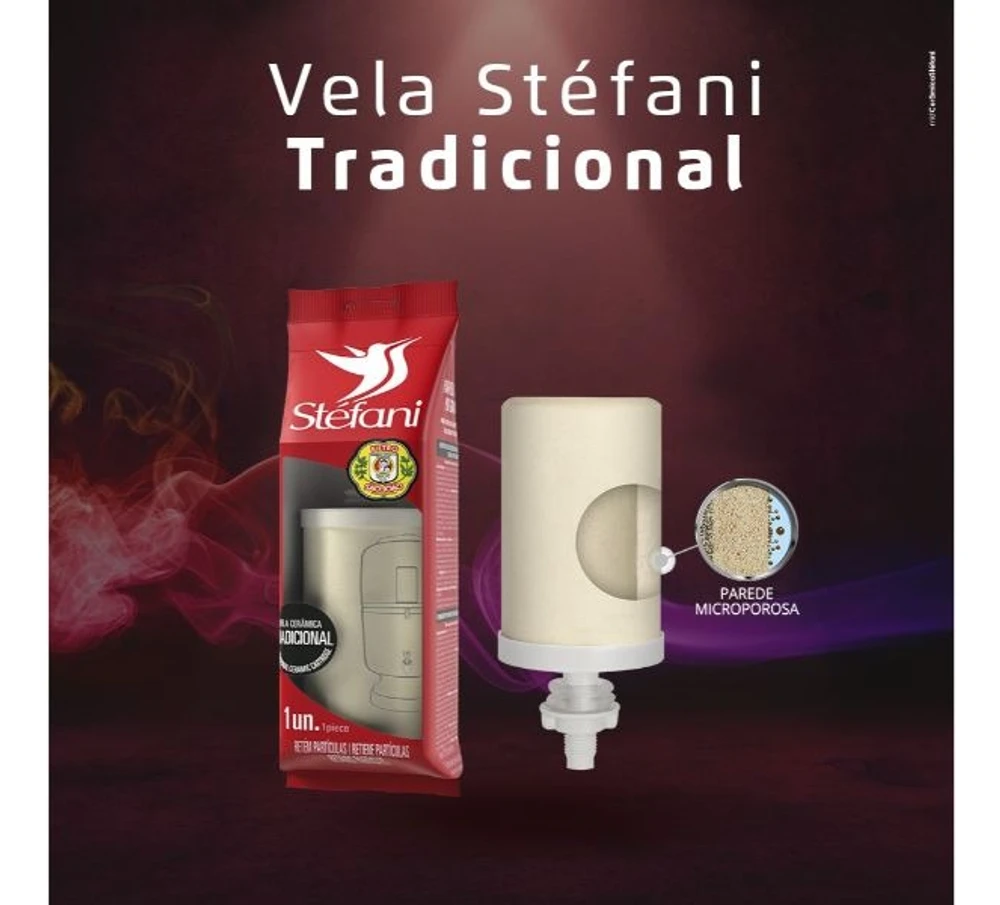 03 und Vela Para Filtro Tradicional VermelhaDescriçãoVela Stéfani Tradicional ? Feita de cerâmica microporosa, filtra e retém as partículas sólidas em suspensão na água, deixando-a cristalina.(Retém Partículas) Vela feita em material cerâmico com parede microporosa que filtra a água por gravidade, sem adição de produtos químicos, reduzindo impurezas e retendo partículas sólidas, o que garante uma água saudável livre de partículas.Indicado para uso nos modelos Flex, São João, Tradicional e São João Premium, porem as Velas Stéfani são compatíveis com a maioria dos filtros de água por gravidade.As Velas Stéfani sem dúvida, não há meio mais seguro e eficiente de oferecer água saudável.EspecificaçõesComposição Básica do produto: Cerâmica Branca, PS, PVC e Hot MeltCada Vela filtra entre 0,5 a 3 litros de água por hora durante sua vida útil de 500 litros ou 6 meses de uso, recomenda-se a troca, o que ocorrer primeiroDescartar os 12 primeiros litros de água filtrada por elemento filtrante (vela) antes da utilização. Ex. 2 velas = descartar 24 litros.InformaçõesMarca: StéfaniModelo: Vela cerâmica tradicionalTroca: 500 litros ou 6 mesesComprimento aproximado: 14cmDiâmetro aproximado: 7cm'.